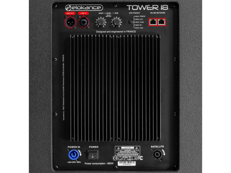Tower 18 public address system, max. 3,400 W.elokance Tower 18Active sound system