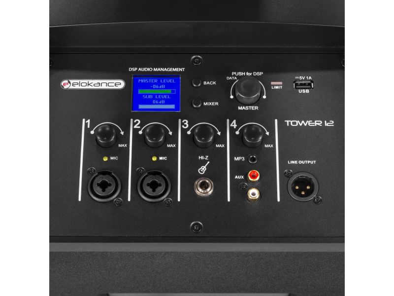 elokance Tower 12, 3-way 2,000 W peak active floorstanding PA system with DSP, Bluetooth 5.3 and covers included. Ideal for DJs, contractors or professional events.elokance Tower 123#channel active professional PA systemSupplied with carrying bags (1 bag...