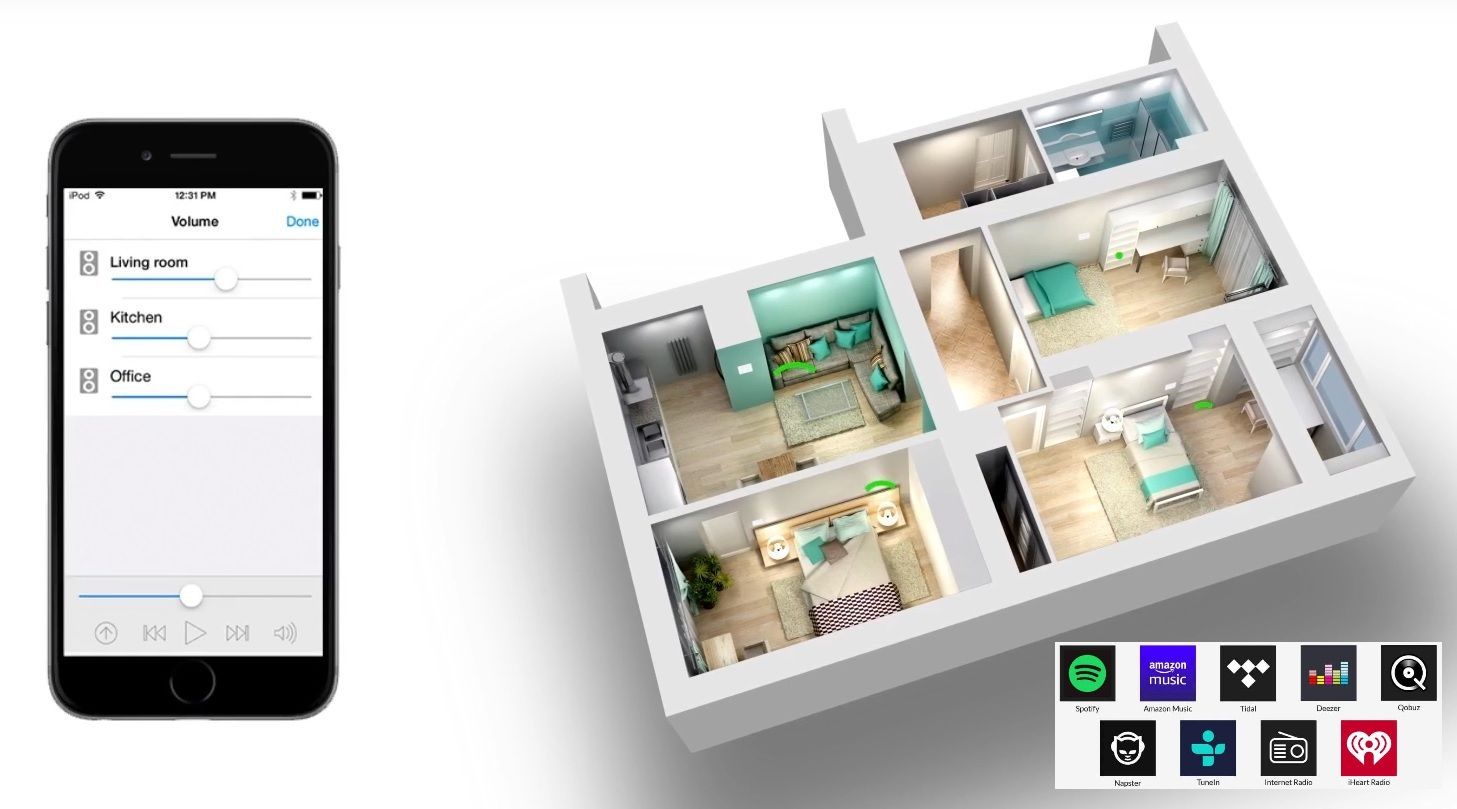 Inteligentné ozvučenie obytných priestorov ovládané mobilnou aplikáciou s podporou streamovacích služieb Spotify, Tidal, TuneIn, Napster iHeard Radio a iných, prehrávanie audio súborov z úložiska v sieti alebo priame streamovanie z PC, tabletov a smartfónov. Možnosť prehrávania rôznych hudobných zdrojov v zónach, zlučovania zón do skupín, alebo prehrávania jednej hudby v celom systéme. Linkové a optické vstupy a výstupy pre pripojenie ďalších zariadení do audio systému, USB rozhranie pre lokálne prehrávanie audio súborov. Bohatý výber navzájom kompatibilných multiroom zariadení, umožňuje zostaviť systém presne podľa predstáv, použiť bežné pasívne, alebo aktívne reproduktory. K dispozícii sú 2 stereo zosilňovače 2 x 35W a 2 x 50W + 2 x 50W v inštalačnom šasy dva 1-zónové streamre S-10, S-50PRO , jeden 4-zónový streamer a jeden 4-zónový zosilňovač. Zariadenia komunikujú po sieti LAN aj WLAN, takže nieje potrebné inštalovať novú kabeláž.