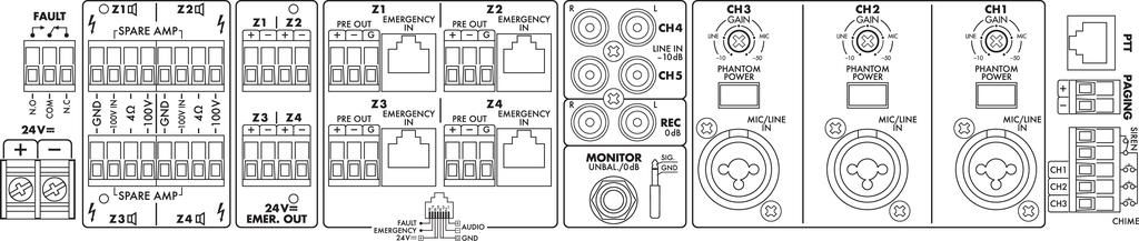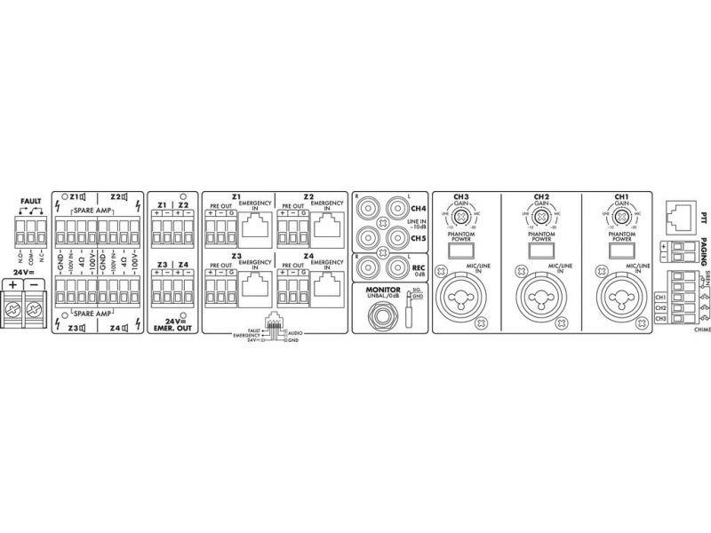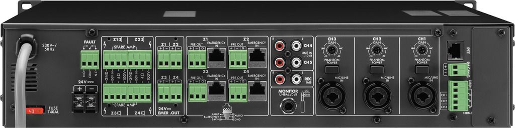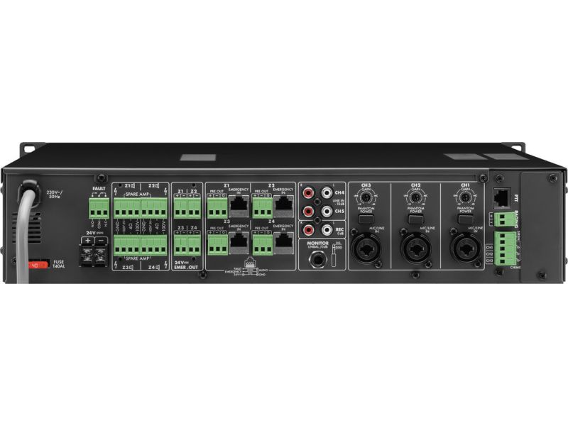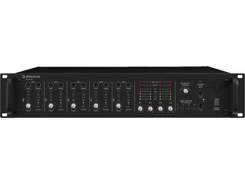 4-zónový mixážny mono zosilňovač, so 4 aktívnymi 120W výstupmi, pre vytvorenie viaczónového ozvučovacieho systému PA. Prepínač umožňuje každému z 5 vstupov priradenie k jednému zo 4 výstupov. Preto je možné reprodukovať rôzne programy v rôznych oblastia...
