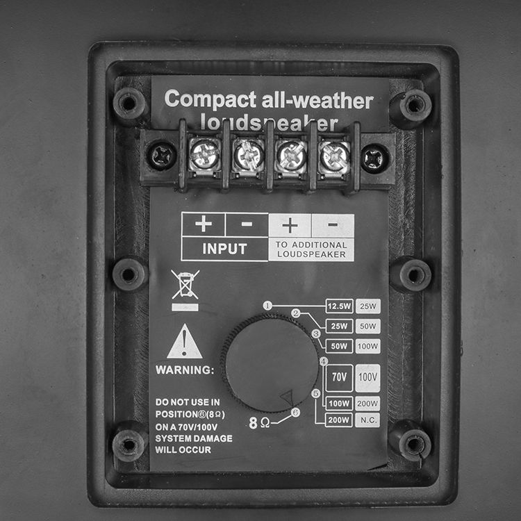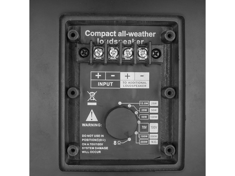 Hudobný reproduktor odolný voči poveternostným vplyvom 200WRMS (IP66) Pre ozvučenie vonkajších priestorov, športových hál, futbalových ihrísk, detských ihrísk, parkov... 100V technológia, 5 výkonových odbočiek (200/100/50/25/12,5W) Možnosť prevá...