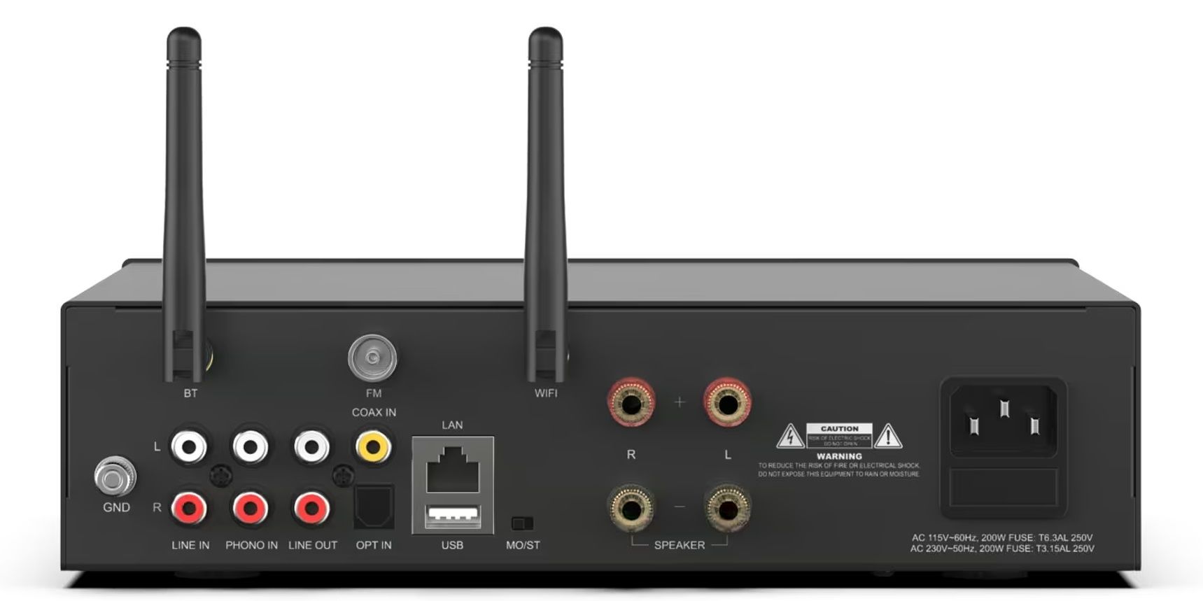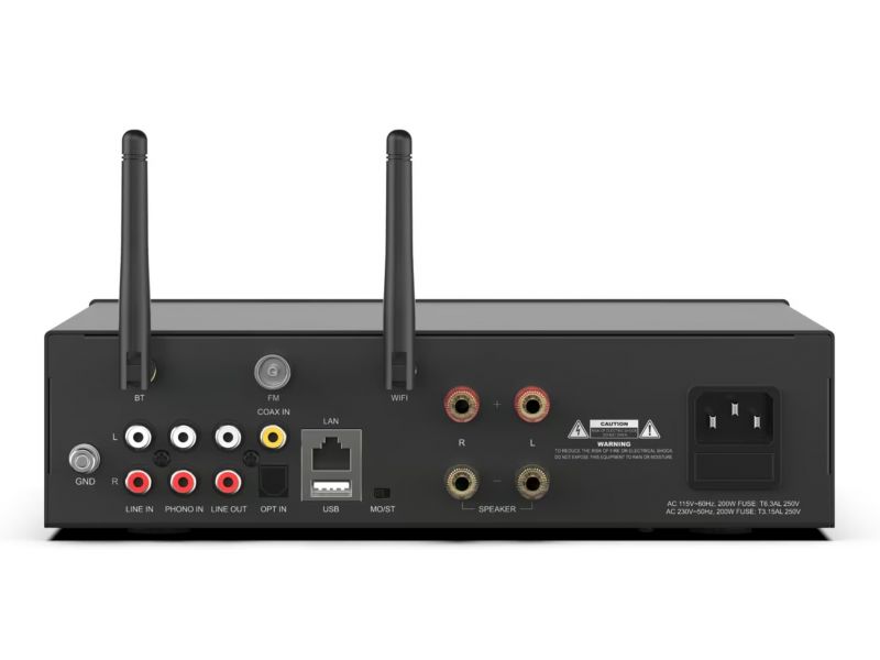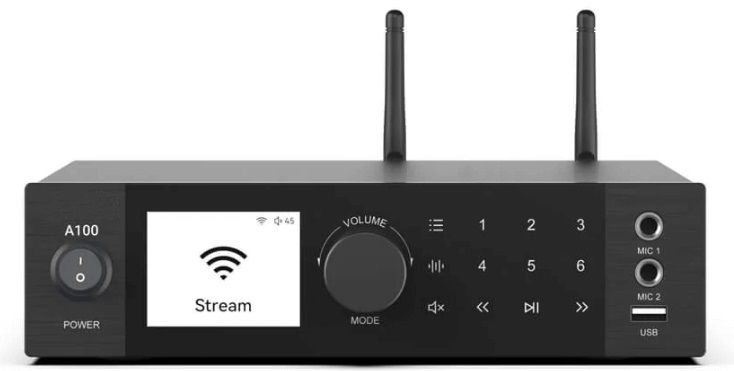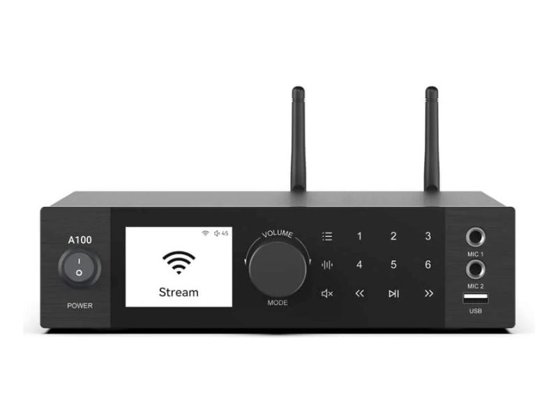 A100 je 2 x 100W zosilňovač s WiFi a BT, ktorý je vybavený mnohými analógovými a digitálnymi vstupmi vrátane linkového vstupu, phono vstupu, optického vstupu a koaxiálneho vstupu. Je tiež vybavený FM rádiom pre miestne rozhlasové stanice. A100 tiež stavia s 2 mikrofónovými konektormi na vysielanie hlasových správ alebo dokonca na KTV. Hudbu môžete streamovať zo svojho inteligentného zariadenia, služby Spotify alebo AirPlay. Pomocou viacerých zariadení môžete tiež nastaviť bezdrôtový multiroom alebo multizónový audio systém, aby ste mohli prehrávať rovnakú hudbu v rovnakom čase na rôznych miestach. A100 podporuje bezdrôtové pripojenie 2.4G WiFi a BT 5.0. Podporuje tiež protokoly Airplay, DLNA a UPnP. Hudbu môžete ľahko bezdrôtovo streamovať z mobilu, počítača alebo zariadenia NAS v miestnej sieti.