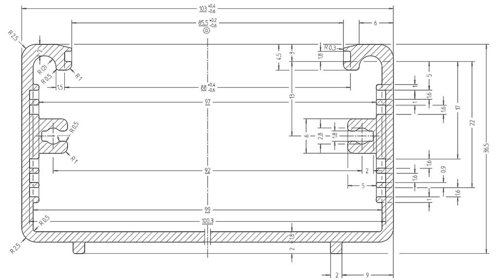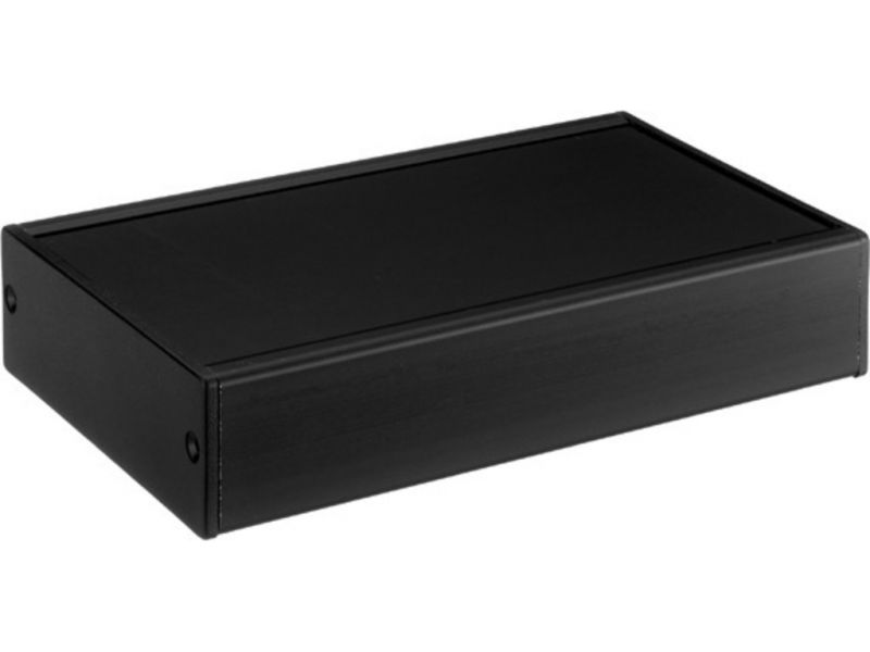 Úžitkové puzdro profil v tvare písmena U so zasúvacími drážkami pre plošné spoje Vymeniteľný predný panel s ochrannou fóliou, 1.5 mm hliníkový plechMatné čierne plastové bočné kryty ABS Povrch materiálu: čierny Celková výška: 36.5 mm