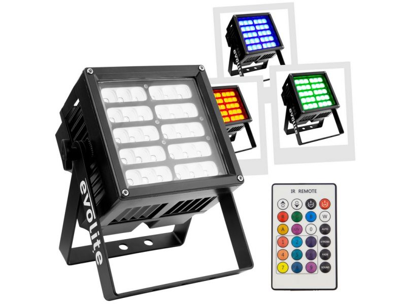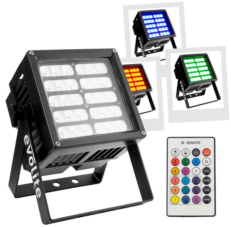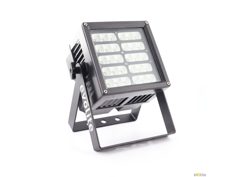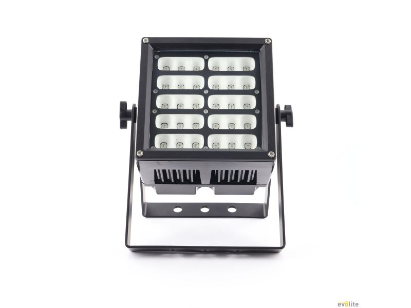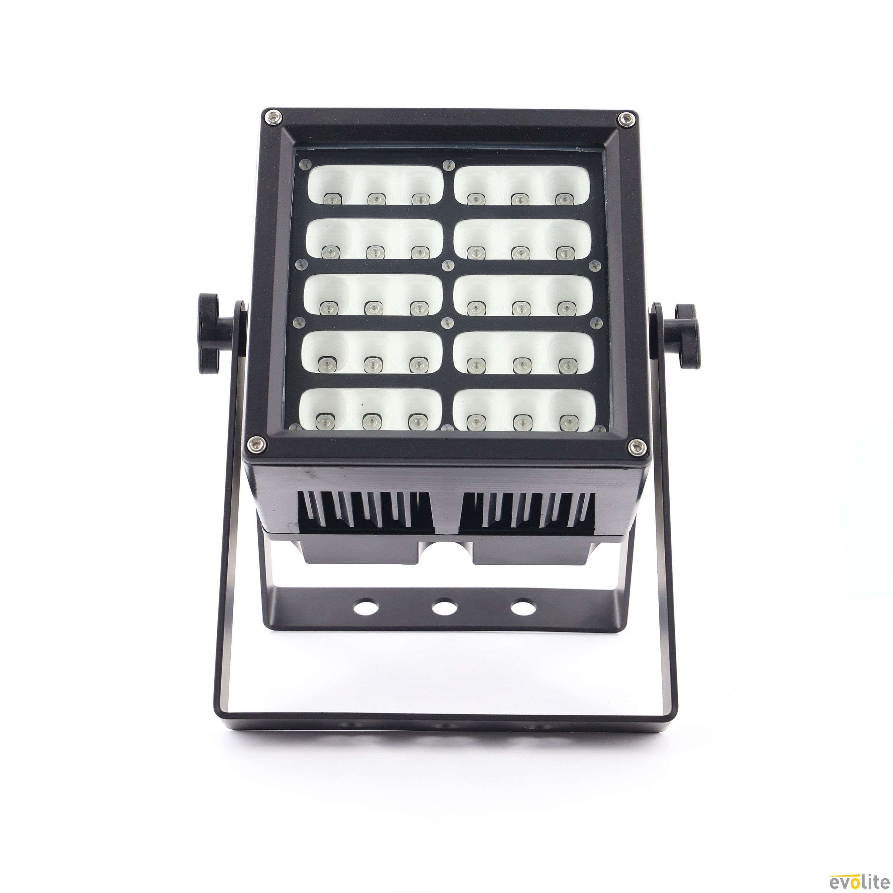 Battery-powered 30x5W RGB LED architectural projector with revolutionary reflector system. Ideal for very wide facade lighting outdoors or indoors.