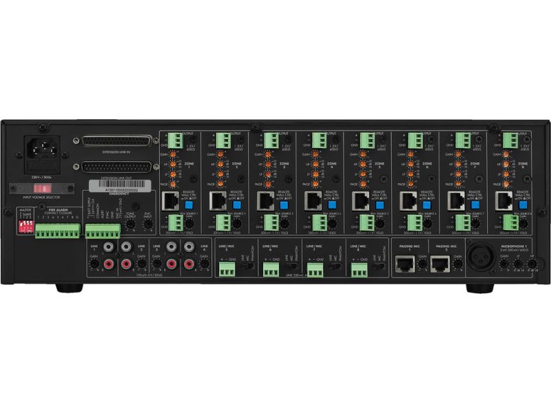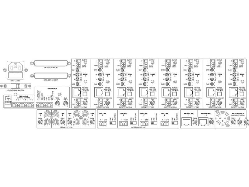 Zapojením master/slave je možné rozšíriť systém až na 32 výstupných zón. Dostupné sú rôzne signálne alarmy a lokálne mikrofóny.