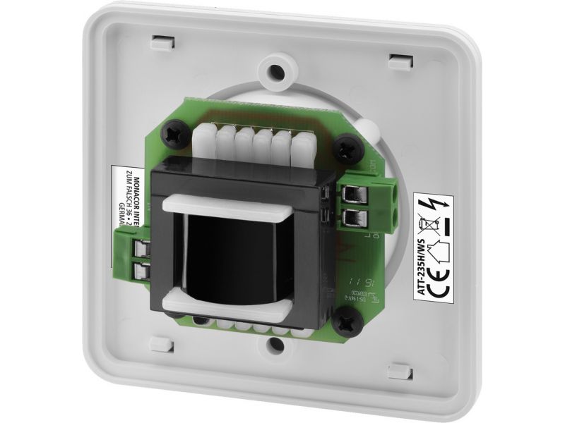 Nástenný ovládač hlasitosti PA Zapustené ovládanie, aby sa zabránilo neúmyselnému prestaveniu Stlmenie v 11 krokoch a OFF Audio transformátor pre 100 V linkovú technikuBiely plastový predný panel (odnímateľný) a gombík Zapustená montáž do štandardných...