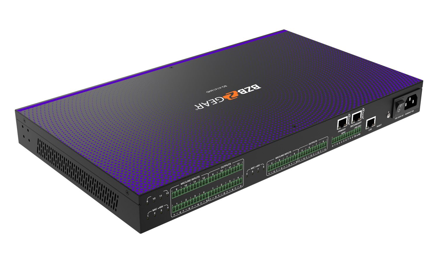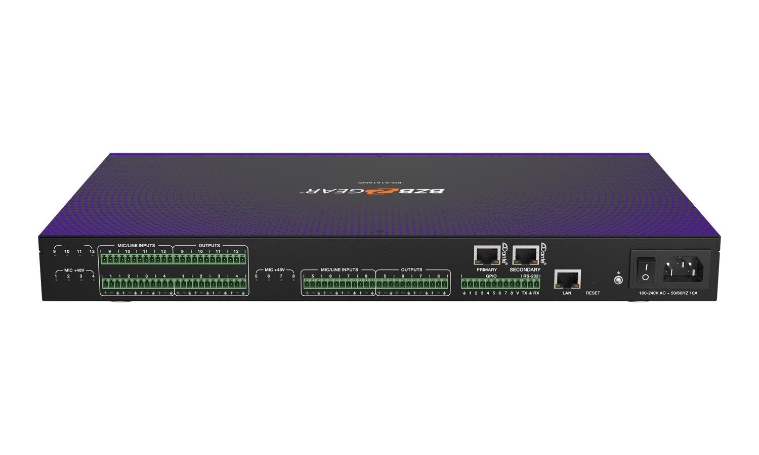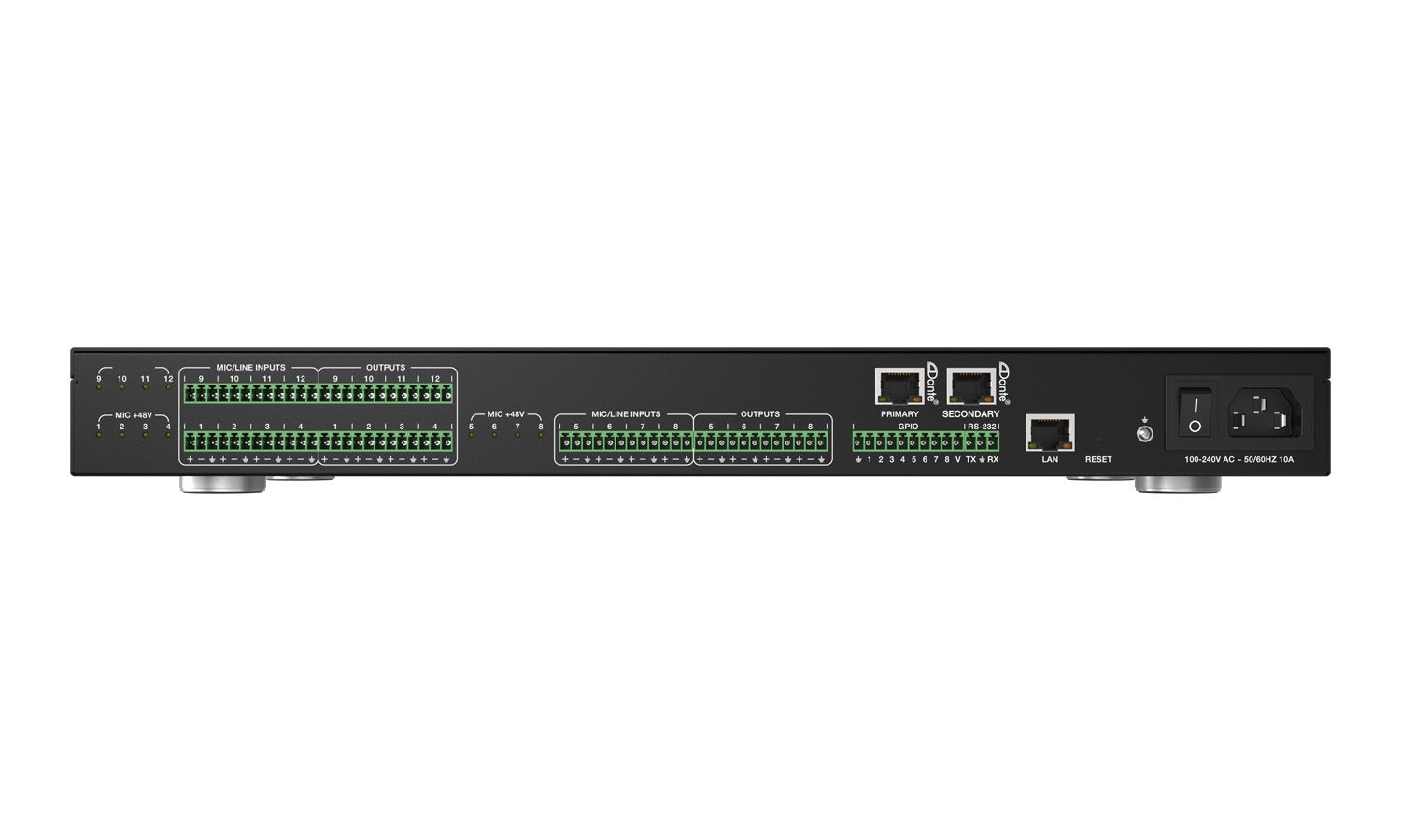 Súčasťou je 12 univerzálnych Mic/Line I/O kanálov, ktoré možno vybaviť phantom napájaním (pre kondenzátorové mikrofóny) a detailne upravovať pomocou 10-pásmového EQ, kompresora, limiteru, oneskorenia (delay) či zisku (gain). Zariadenie je vybavené AEC a noise suppression, čo zaisťuje čistý a zrozumiteľný zvuk bez ozveny a šumu – kritické pre videokonferencie.
