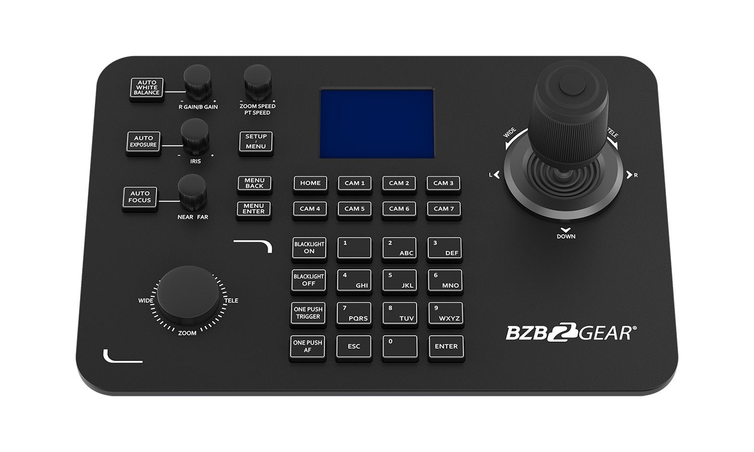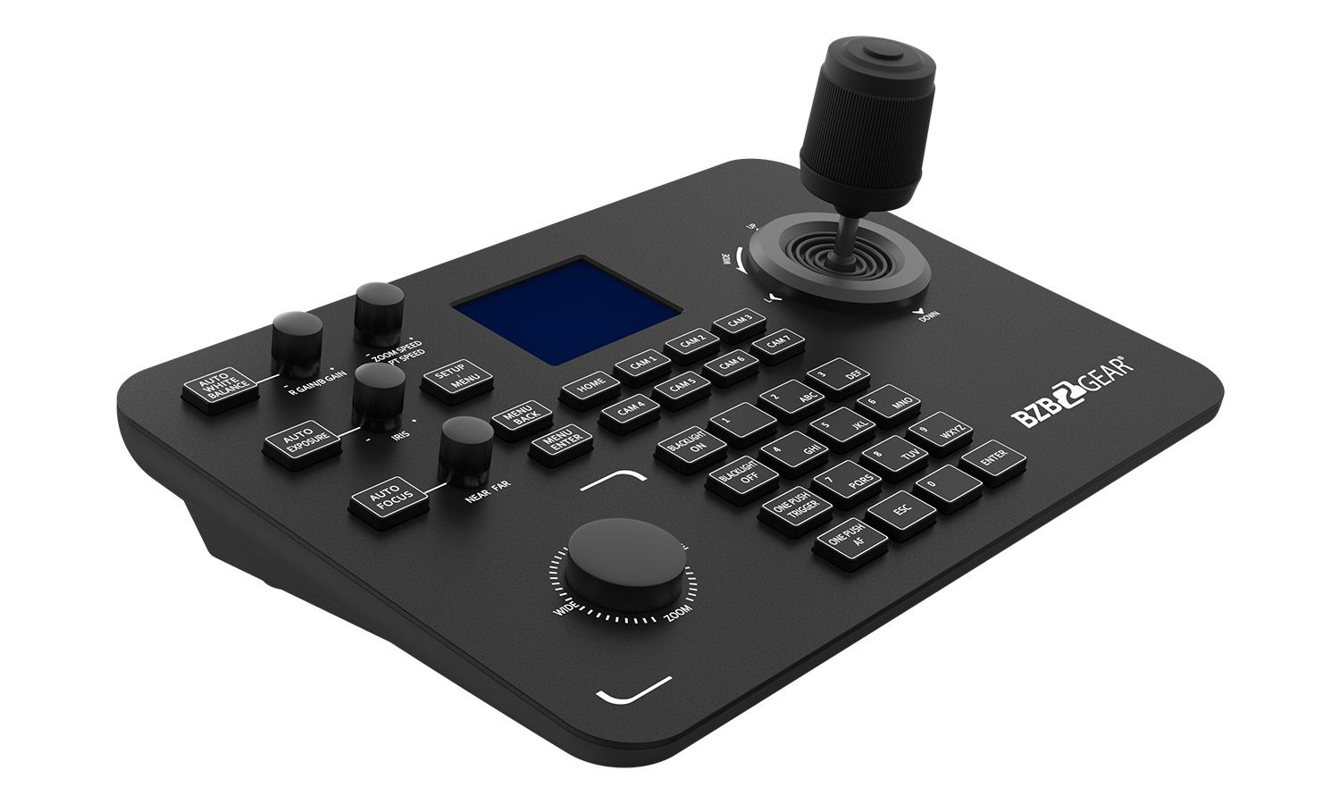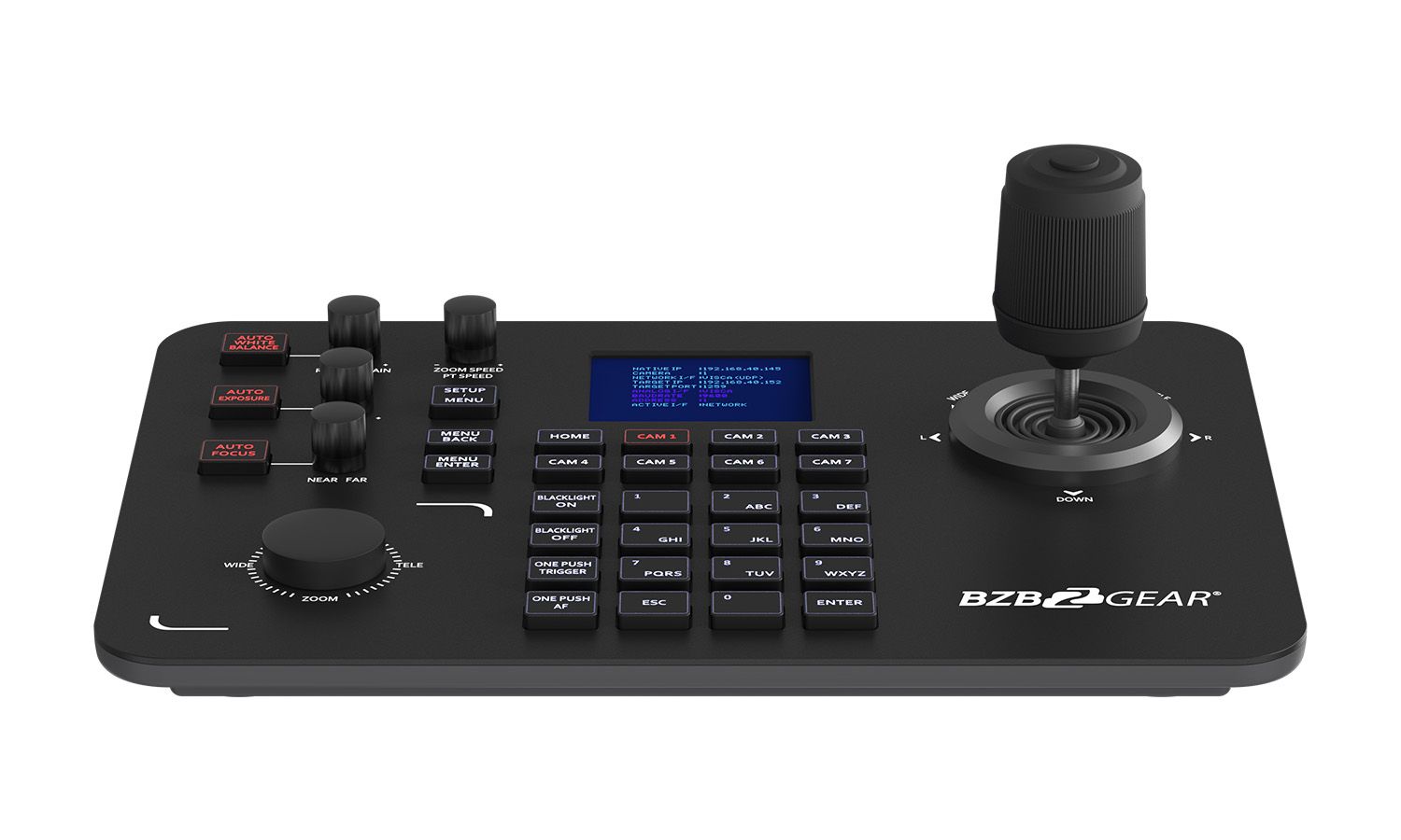 Pokročilý joystick ovládač navrhnutý pre efektívne a presné riadenie PTZ kamier v profesionálnych inštaláciách. Podporuje IP protokoly (cez LAN s PoE) aj tradičné sériové pripojenia (RS232, RS422, RS485), vďaka čomu je kompatibilný s väčšinou PTZ kamier na trhu. Ovládač podporuje najrozšírenejšie protokoly vrátane IP VISCA, RS-232 VISCA, Pelco-D a Pelco-P, čím zaisťuje maximálnu flexibilitu v rôznych typoch projektov – od jednoduchých zasadacích miestností až po zložité štúdiové prostredia. Pohodlné ovládanie zabezpečuje ergonomický joystick, otočný ovládač na zoom/focus a intuitívne tlačidlá pre prepínanie medzi kamerami, aktiváciu predvolieb (presets) a menu navigáciu. Veľkou výhodou je farebný LCD displej, ktorý zobrazuje aktuálne nastavenia a stav pripojenia.