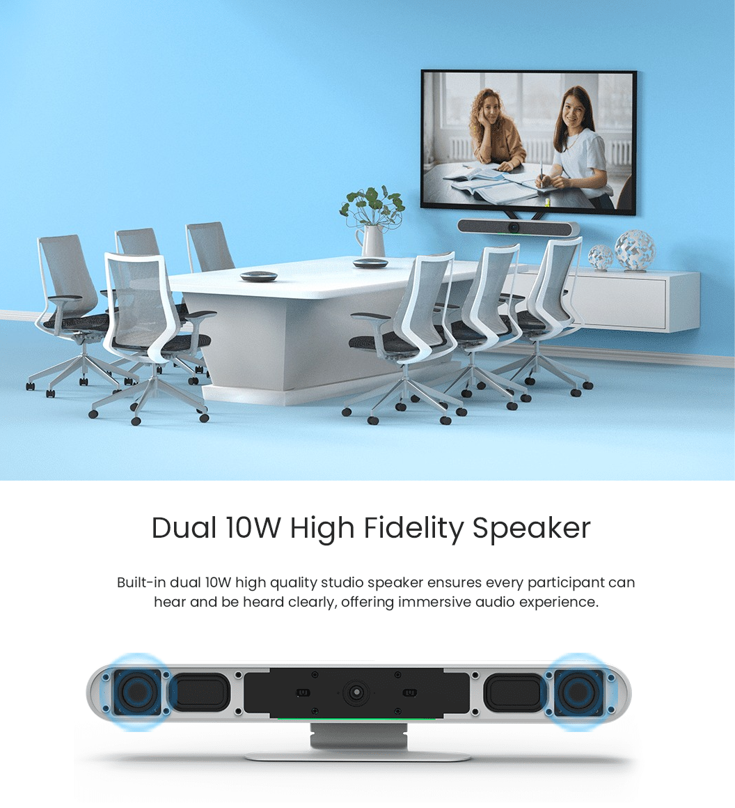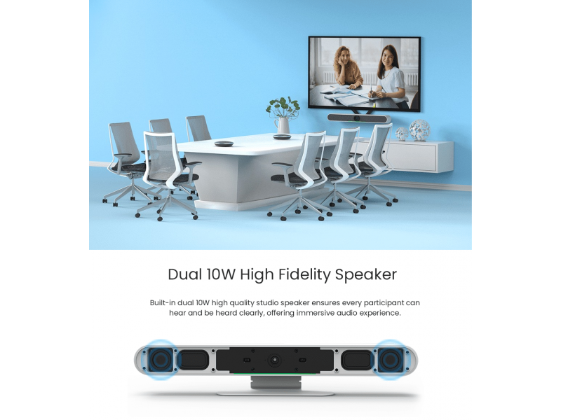 Vstavaný duálny 10 W štúdiový reproduktor BG-Cyclops-4K zaručuje, že každý účastník môže jasne počuť a byť počutý. Sofistikovaná sústava 6 MEMS mikrofónov disponuje funkciou lokalizácie a sledovania hlasu, ktorá v reálnom čase detekuje polohu prezentujúceho a zameriava sa na neho, čím odstraňuje akúkoľvek neistotu ohľadom toho, kto práve hovorí.
