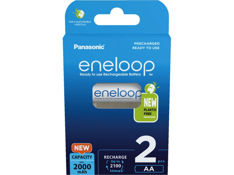 Eneloop rechargeable NiMH batteries, AA size, pack of 2, from PANASONIC. Nickel metal hydride Long service life (charge up to 2,100 times) Low self-discharge Ready to use, pre-charged batteries Plastic-free packaging Manufacturer information:...