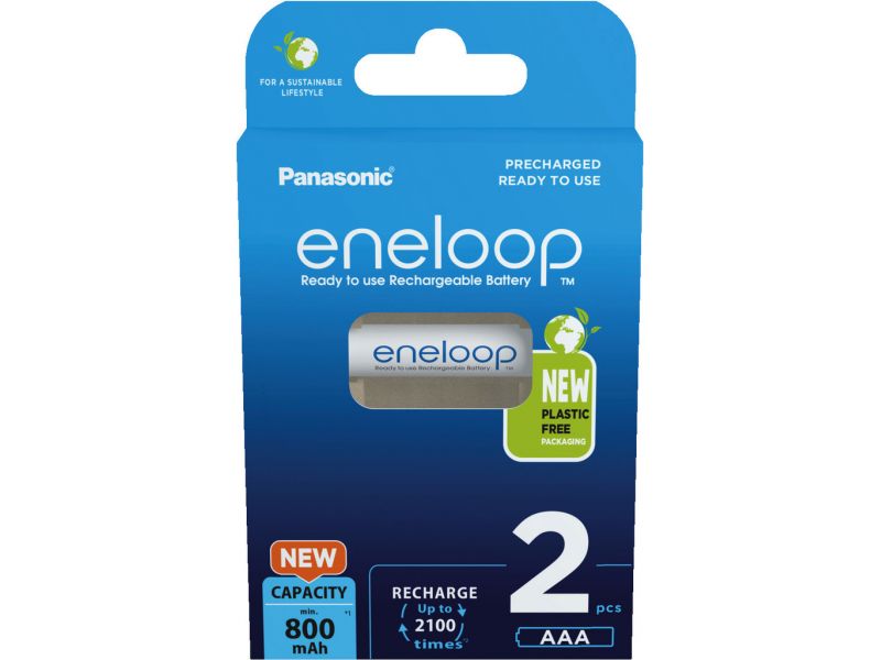 Eneloop rechargeable batteries, AAA size, pack of 2, from PANASONIC. Nickel metal hydride Long service life (charge up to 2,100 times) Low self-discharge Ready to use, pre-charged batteries Plastic-free packaging Manufacturer information: Pan...