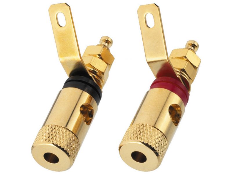 Dvojica reproduktorových pólových svoriek Robustná pozlátená verzia Naskrutkovanie a zapojenie Pre izolované použitie v kovových skrinkách