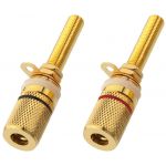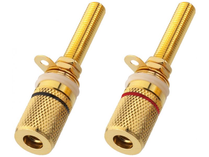 Dvojica reproduktorových pólových svoriek Kvalitná pozlátená verzia Naskrutkovanie a zapojenie Pre drevené skrinky do 25mmPre izolované použitie v kovových skrinkách