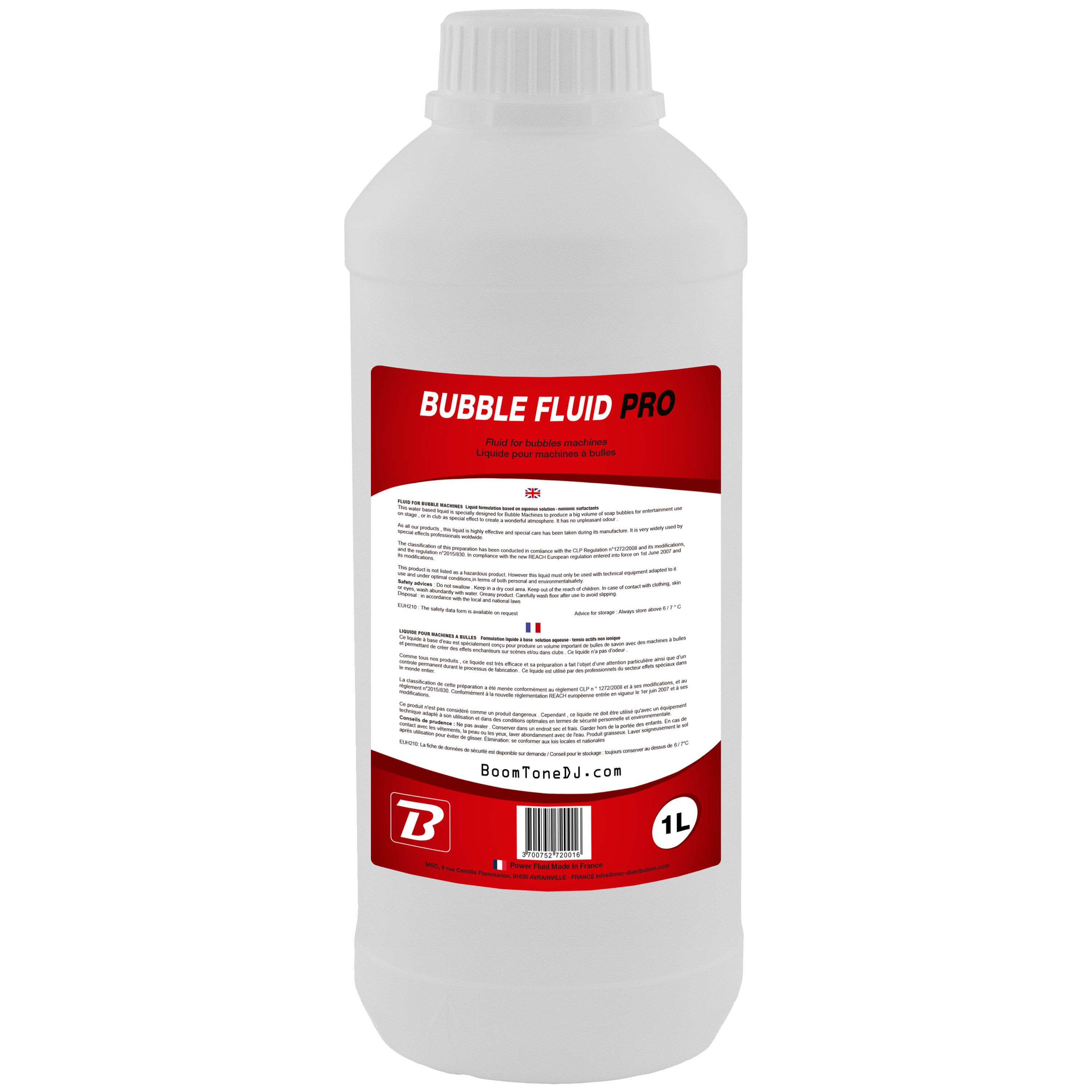 This 1-litre can of BoomToneDJ bubble liquid is designed to provide a generous volume of long-lasting bubbles, ideal for creating a festive atmosphere. It's suitable for all types of bubble machine and complies with European safety standards. Compact and ready to use, it's perfect for one-off events, entertainment professionals or private individuals. - BoomToneDJ Bubble Fluid 1L - Contents: 1 litre of bubble fluid - Use: Ready-to-use liquid for bubble machines - Composition: High-purity aqueous formula - Result: Generates a large volume of long-lasting bubbles - Compatibility: Suitable for all types of bubble machine (water-based) - Appearance of bubbles: Colourless, odourless, long-lasting - Applications: Entertainment, shows, events, leisure activities - Compliance: Complies with European NF and CE standards - Manufacture : Product developed and manufactured in France - Packaging : Recyclable plastic can - Transport: Compact, lightweight format - Total weight: approx. 1.2 kg