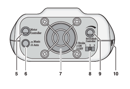 Mini laser efekt obsahuje: Mikrofón na ovládanie hudbou Otvor vyžarovania laserových lúčov Stojan a montážne rameno Otvor pre montáž na stenu alebo strop Ovládač „Motor Controller“ rýchlosti otáčok laserových bodov resp. obrazcov Tlačidl...