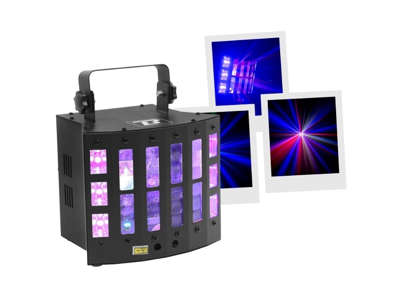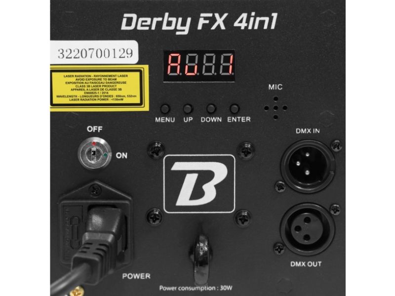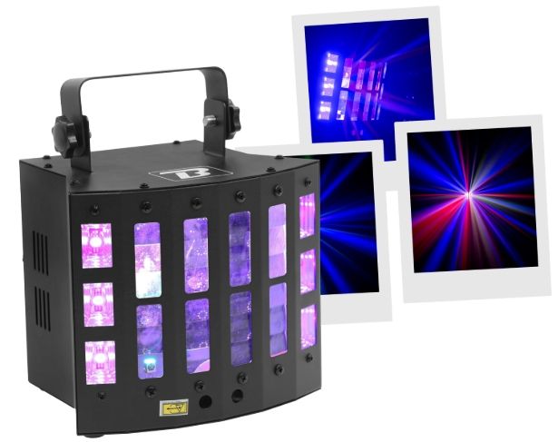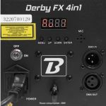 You all know the Derby, here is the DerbyFX 4in1 version with even more original effects. LED light set 4 effects in 1 BoomToneDJ DerbyFX 4in1 Light sources: 9 3W RGBWAPY LEDs 6 white LEDs + UV 2in1 LASER red 120mW + green 30mW DMX Channel...