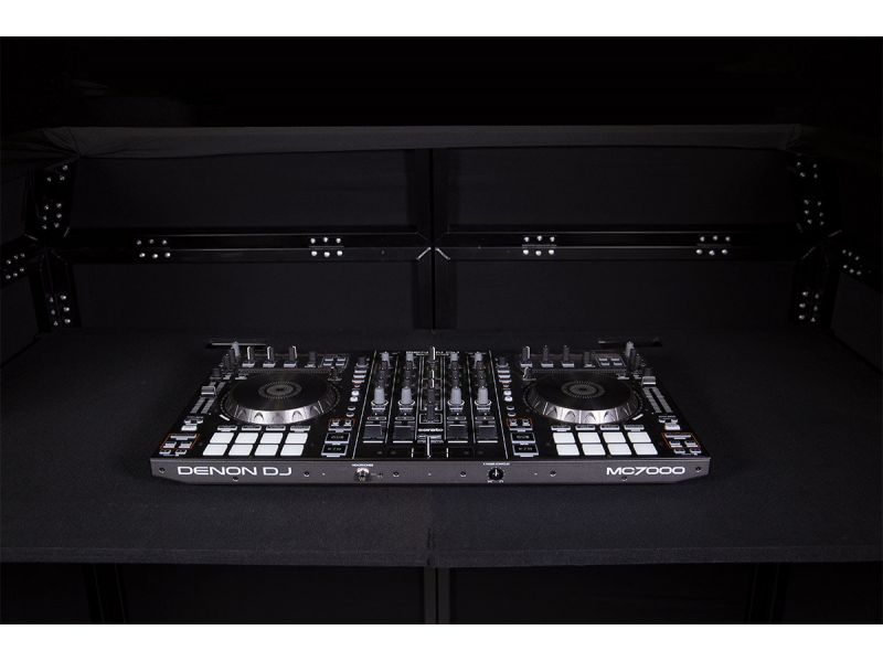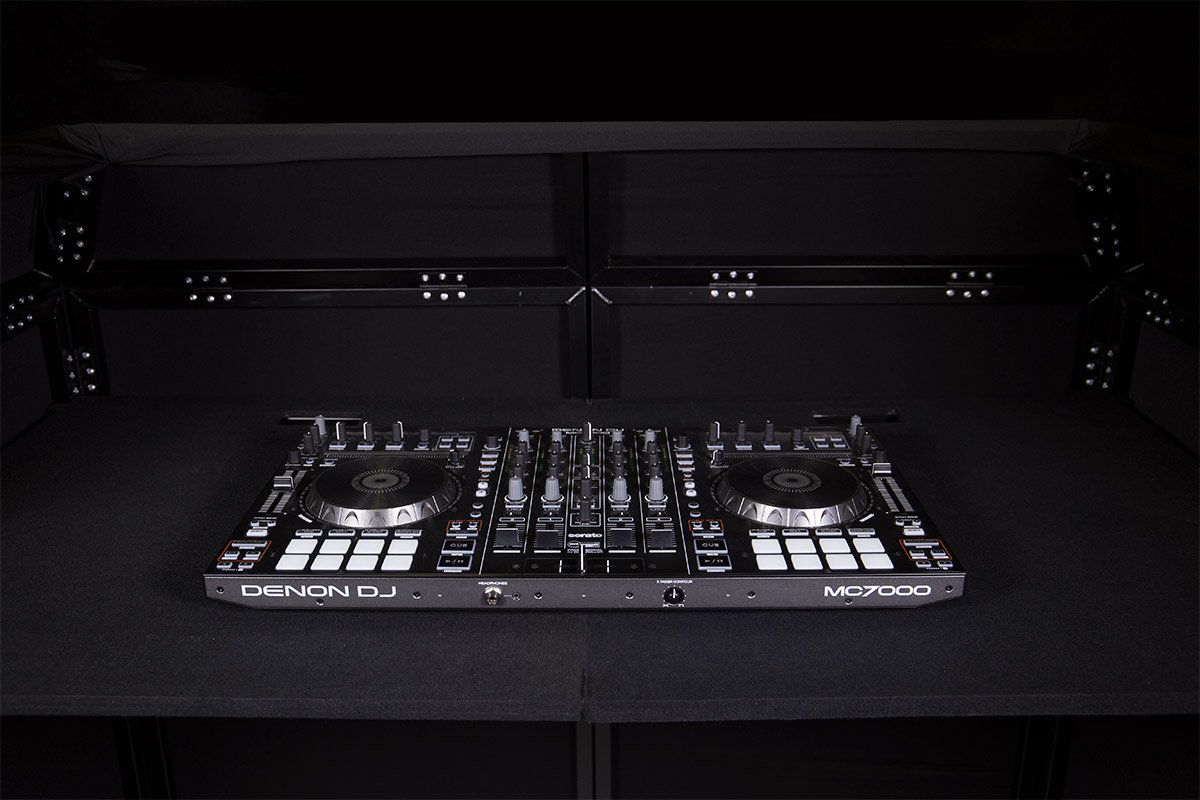 BoomToneDJ DJ STAND PRO Black Removable and transportable DJ furniture Made up of frame with hinges Version with black lycra Can be backlit with LED PAR for example Stand width 1.46m stand height 1.30m