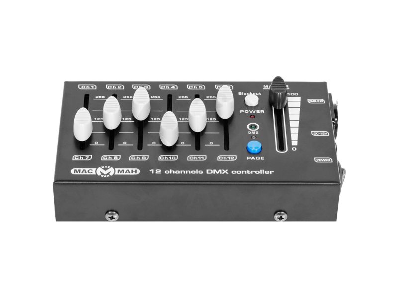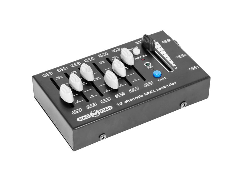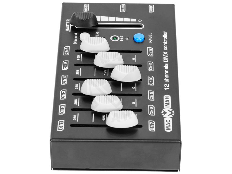 Mac Mah DMX 12: 12-channel DMX console for LED PARs, single faders, Black Out and XLR output. Ideal for parties, DJ sets and small installations.Mac Mah DMX 12DMX console for LED PARTotal of 12 channelsControl 12 DMX channels with 2 pages of 6 fadersBlack...