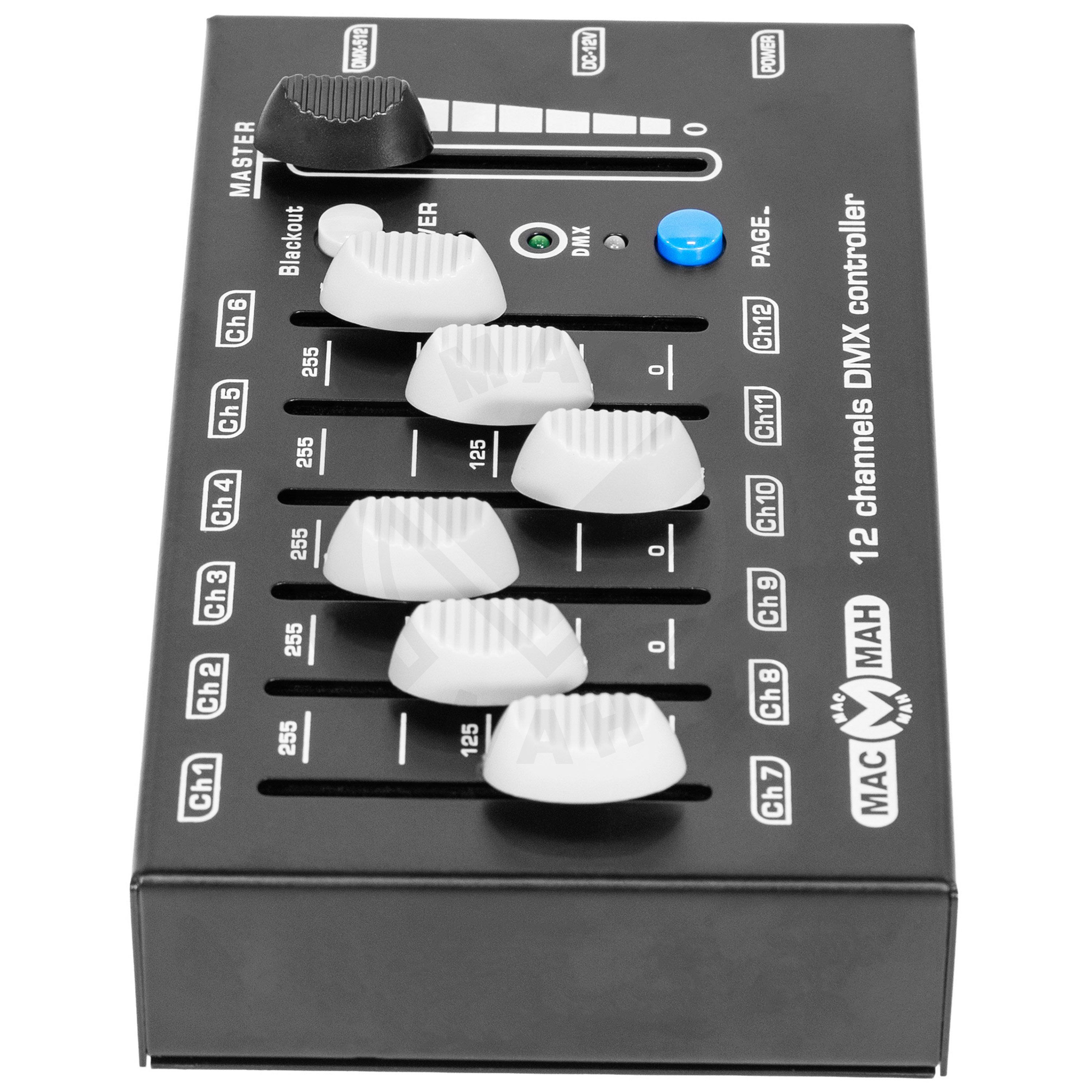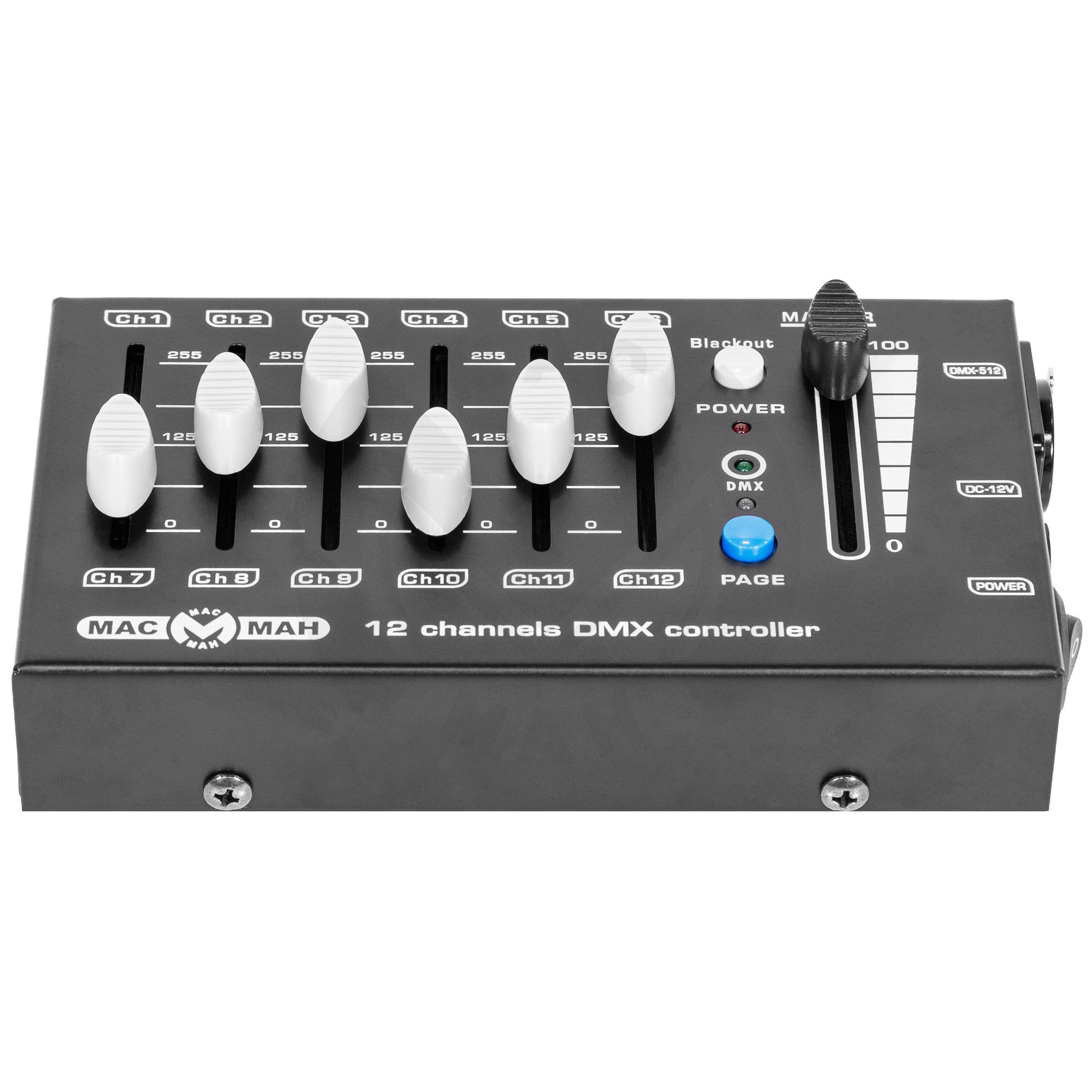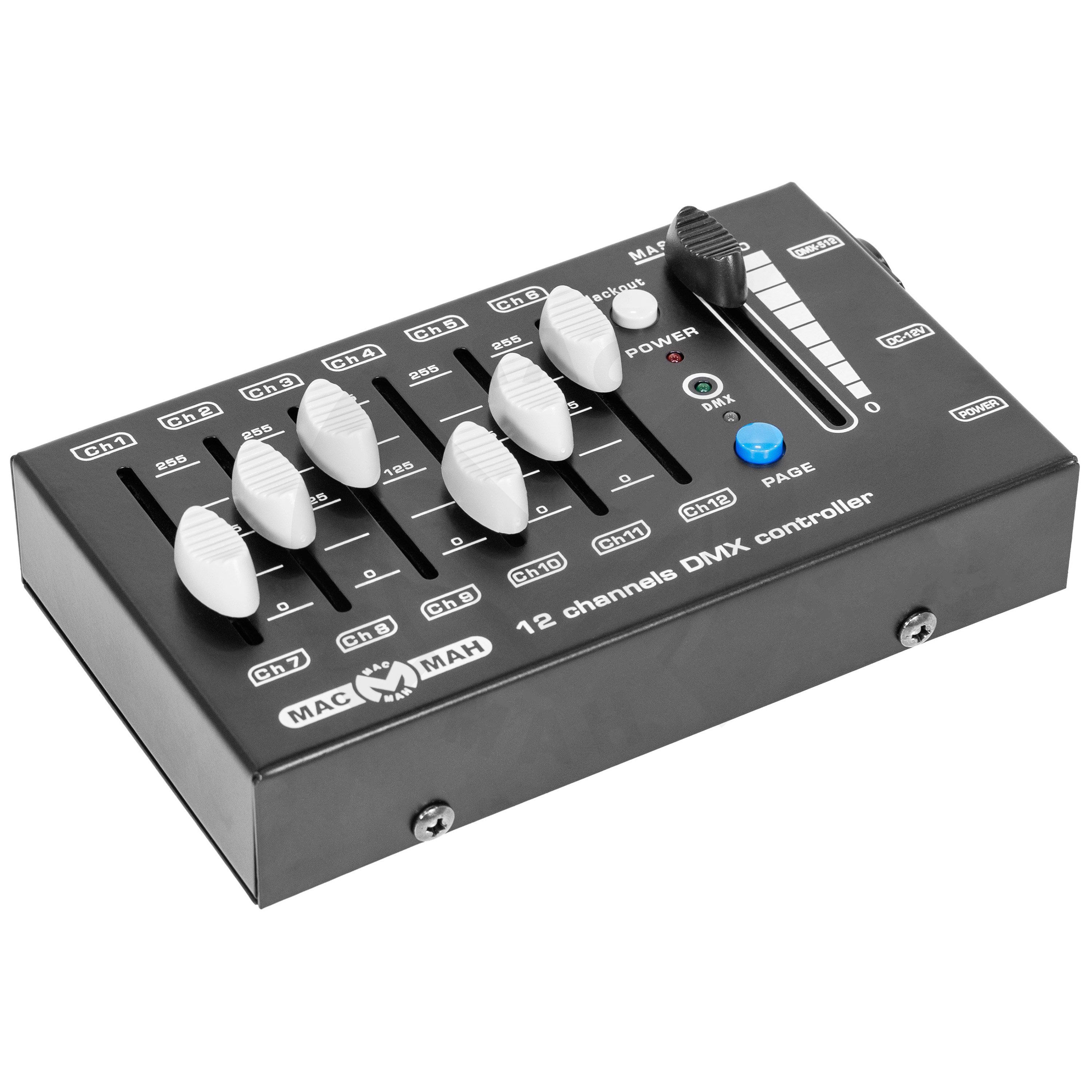 Mac Mah DMX 12: 12-channel DMX console for LED PARs, single faders, Black Out and XLR output. Ideal for parties, DJ sets and small installations.