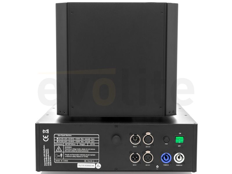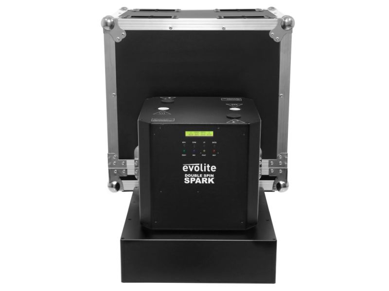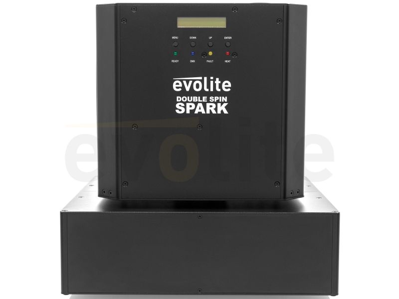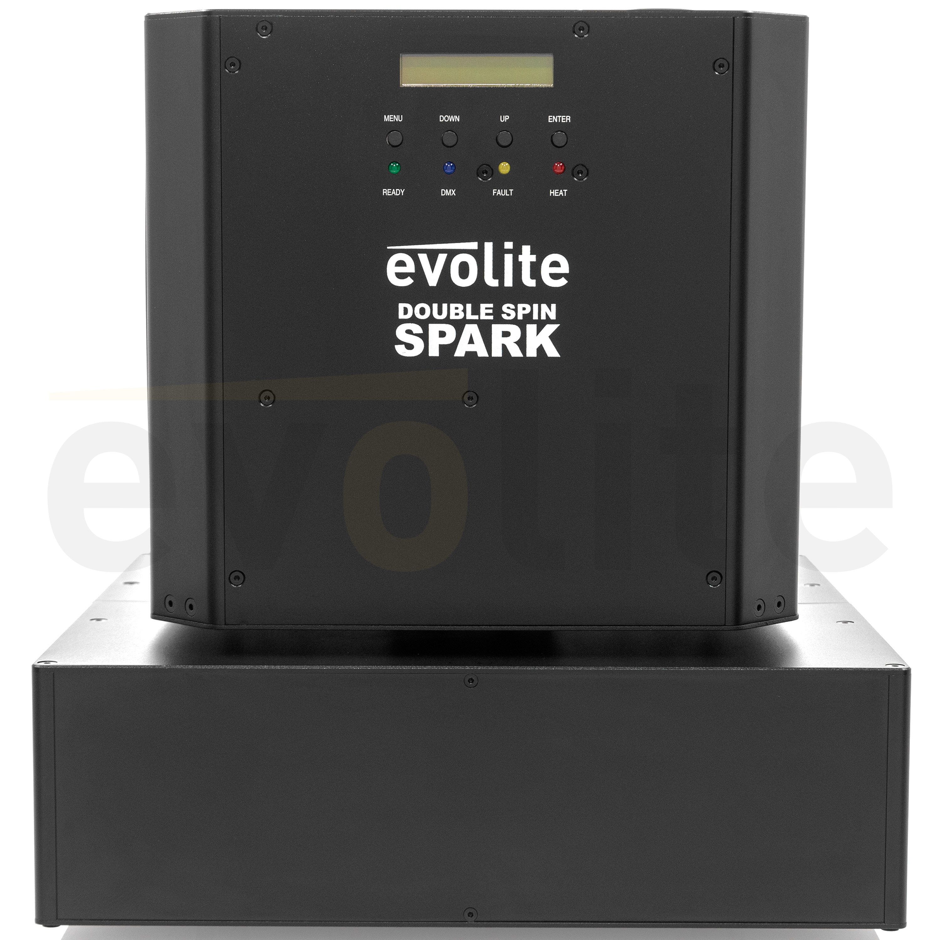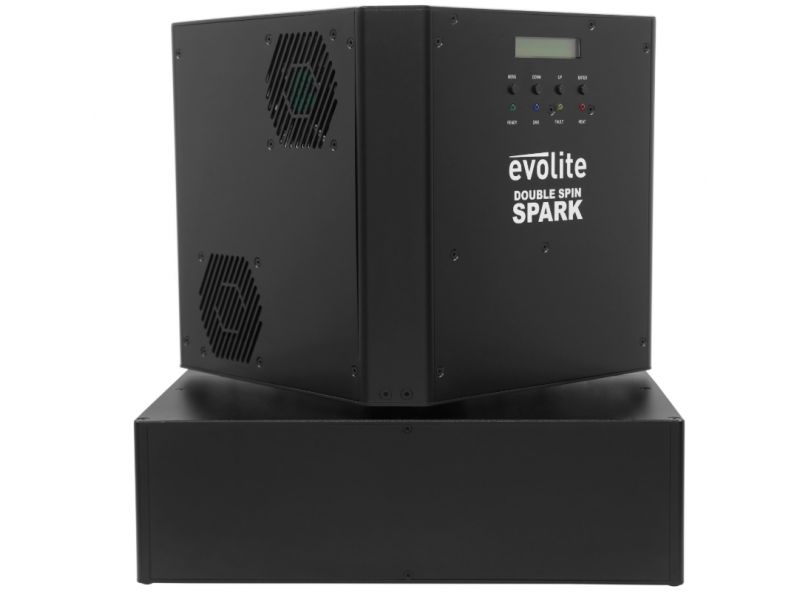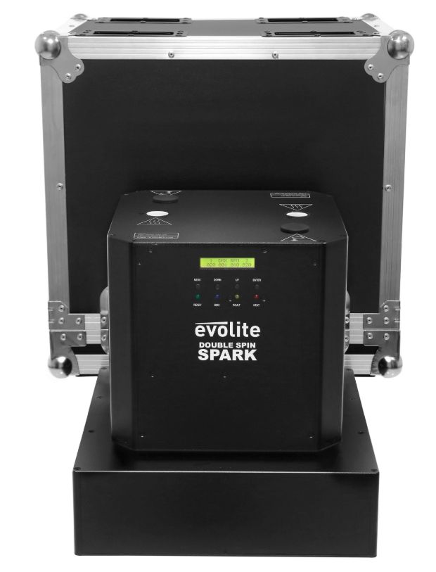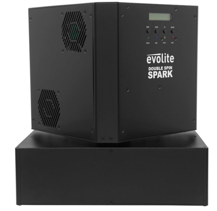 The evolite Double Spin Spark is a rotating cold spark machine with a double jet. The jet height is adjustable.evolite Double Spin SparkDouble rotating professional spark machineUse with evolite Evo Spark Powder only2 or 4 DMX channelsContinuous 360° rota...