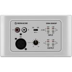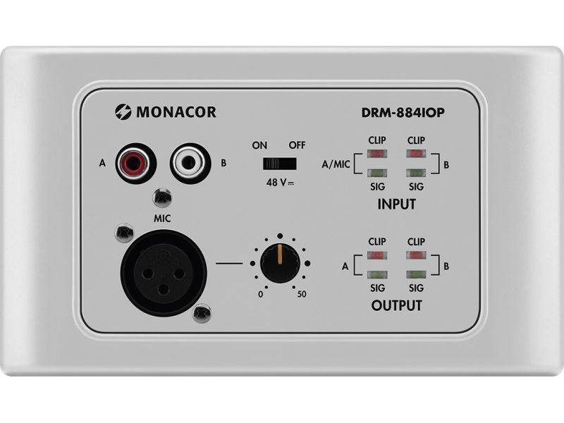 Nástenný modul, pre diaľkové ovládanie audio matrix routeru DRM-884. Zamýšľané použitie: diaľkové ovládanie jednej zóny, lokálne vkladanie zvukových signálov 2 RCA konektory pre linkové signály Nastaviteľné mikrofónne pripojenie cez NEUTRIK 3-pólový XL...