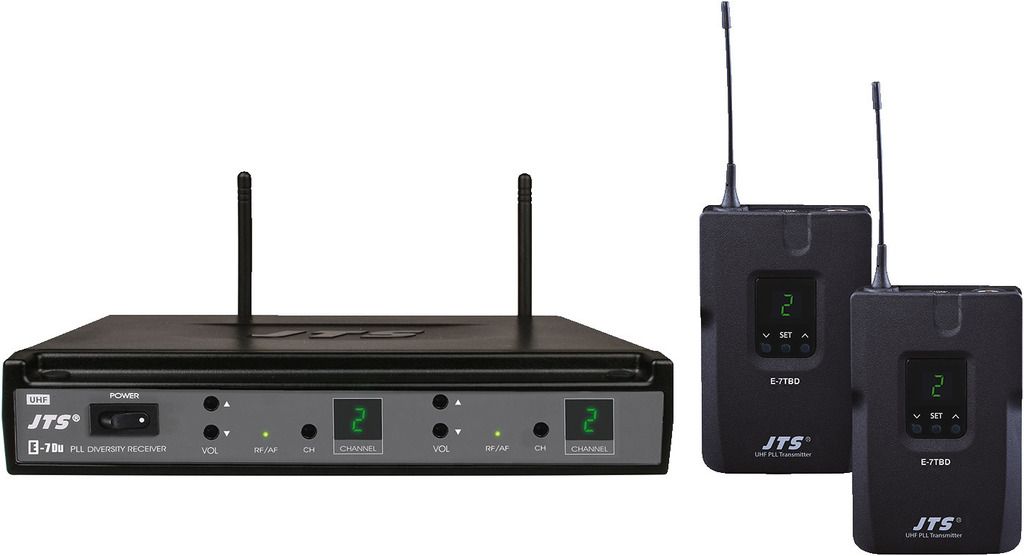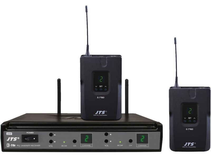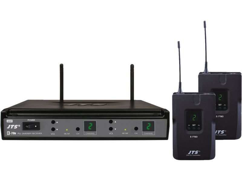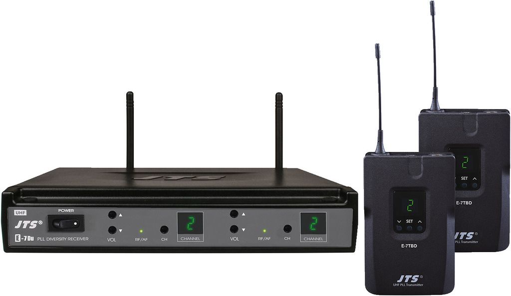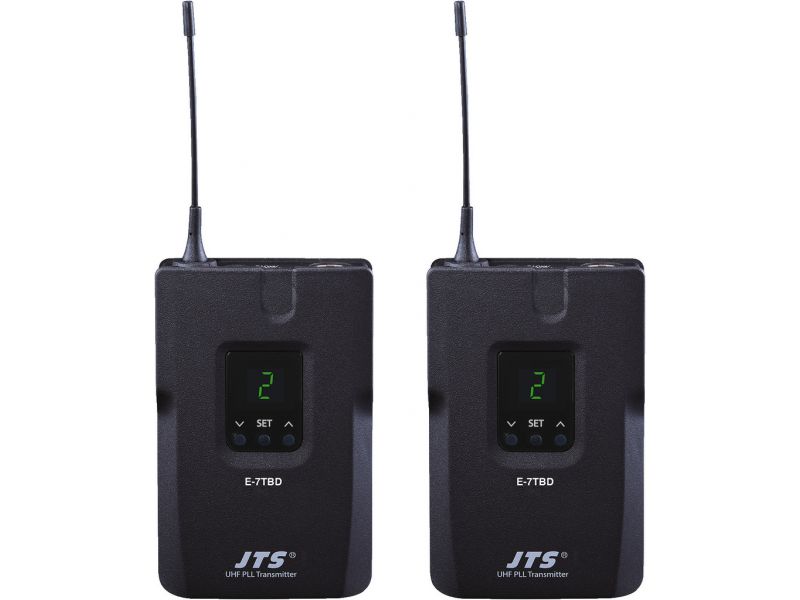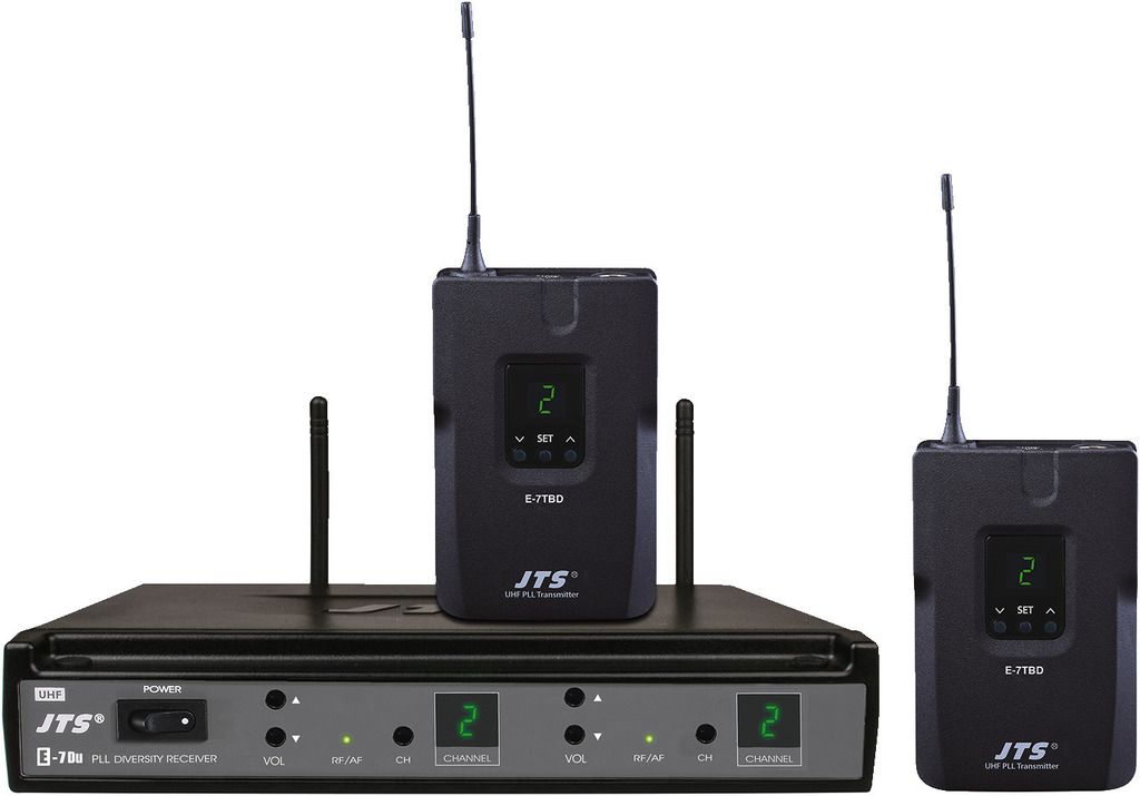 JTS E-7BPSETD/5: Spoľahlivá UHF PLL sada pre bezdrôtový prenos zvuku s diverzitným prijímačom a kravatovými mikrofónmi