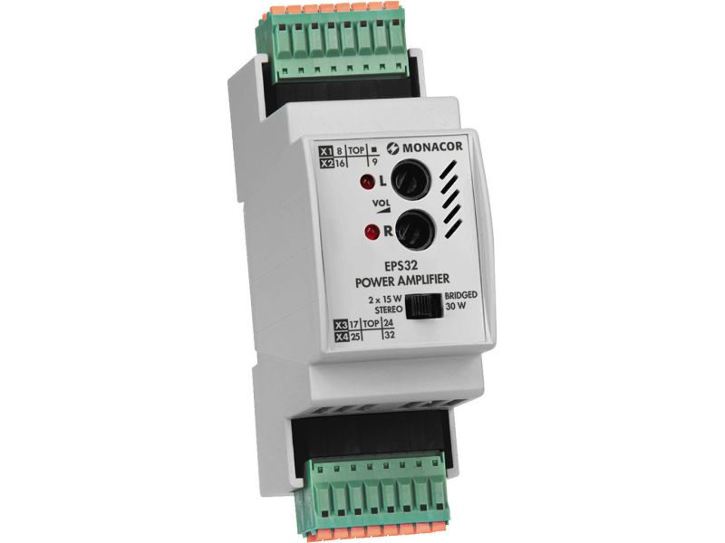 Amplifier, 2 x 15 W For mounting onto DIN rails according to DIN EN 60529, 2 HP 2-channel class D amplifier Selectable mode stereo/bridged Inputs to be switched externally Balanced and unbalanced inputSumming amplifier input Microphone input Separate...