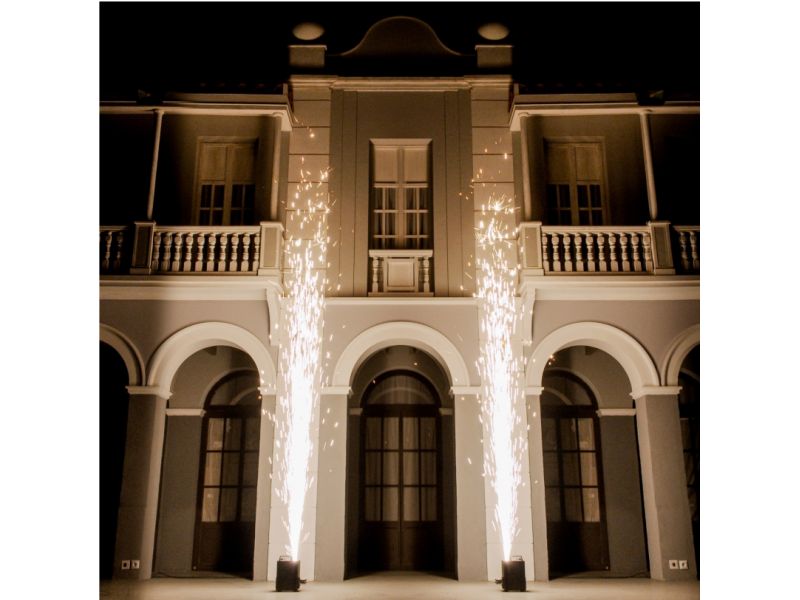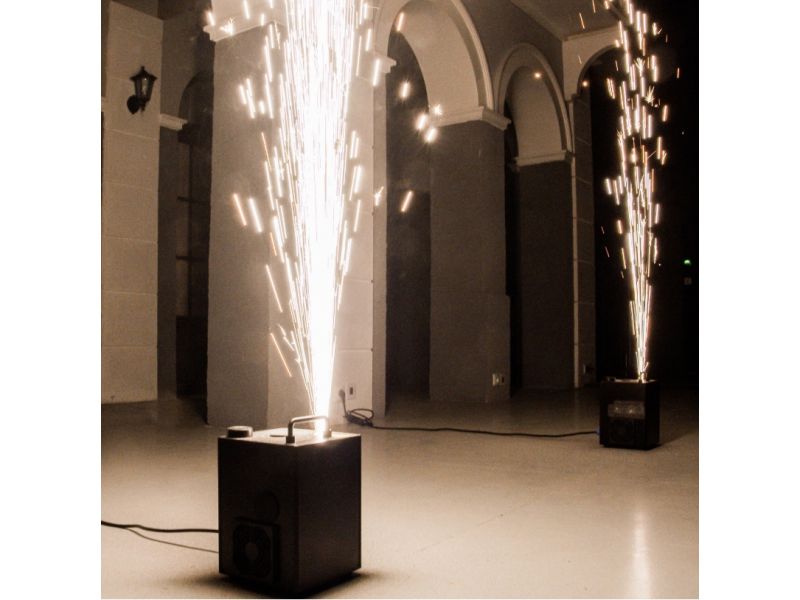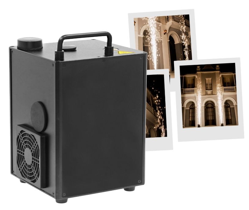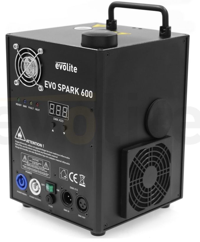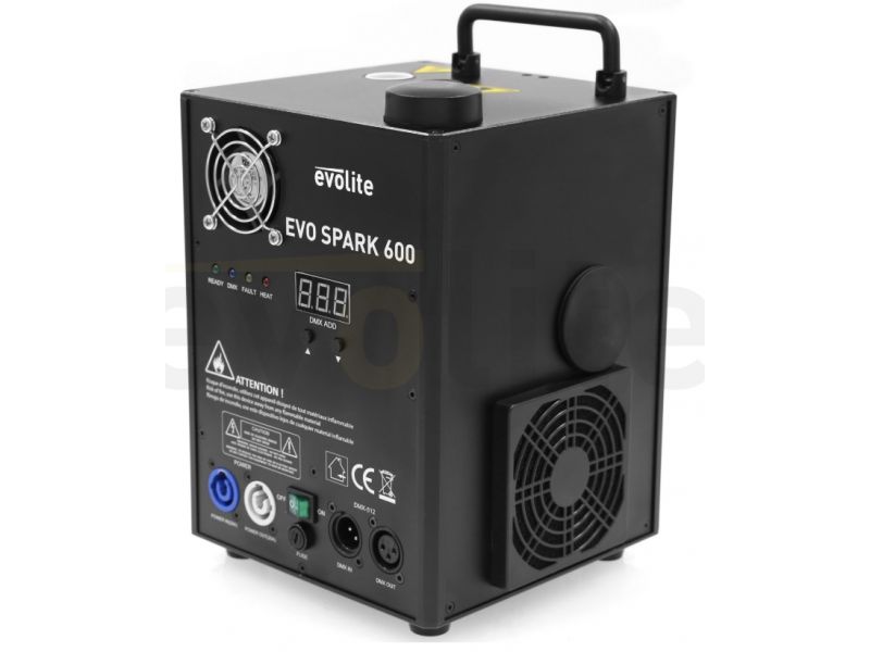 Spark machine with spark height adjustment from 1 to approx. 6 m.Professional spark machineThe Evo Spark 600 is not a machine using pyrotechnics (chemical combustion). This machine uses a metallic powder (titanium) heated electrically, without combustion....