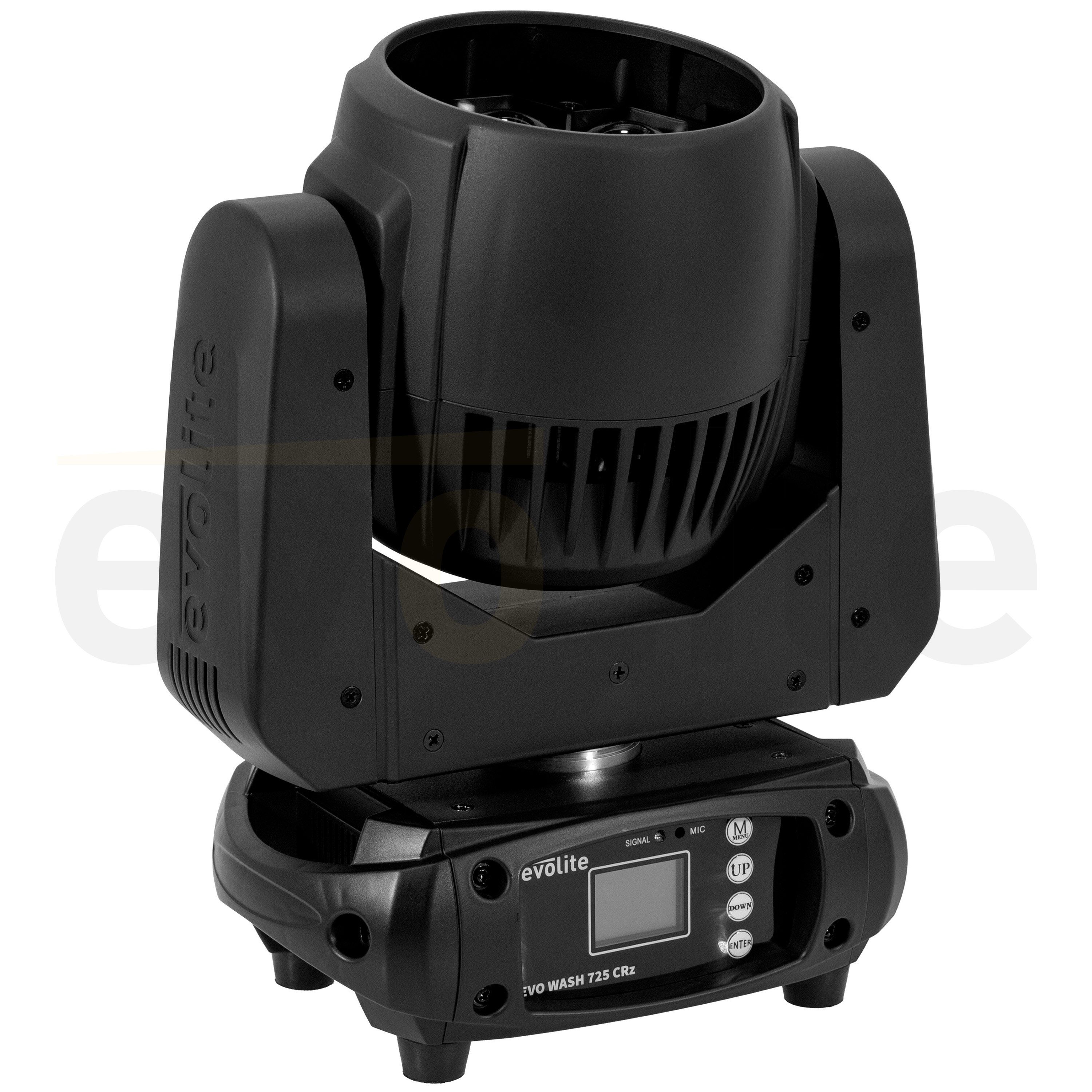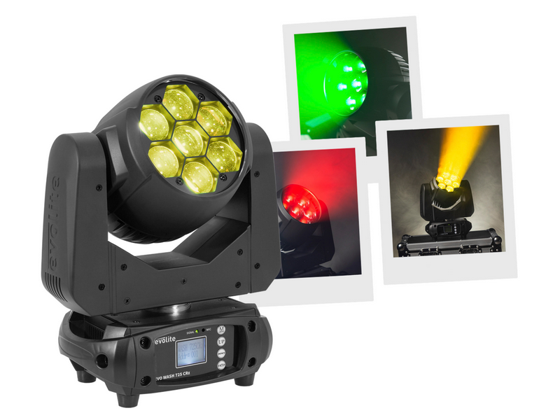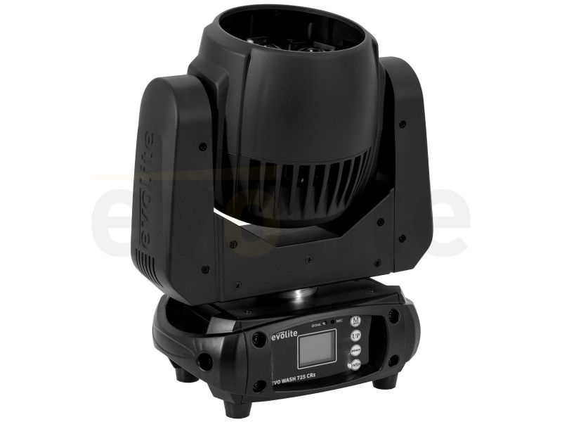 evolite Evo Wash 725-CRz: Wash 7x 25 W RGBW, 6-60° motorised zoom, 15 / 22 DMX channels, auto programmes and adjustable LED frequency for stage and broadcast.evolite Evo Wash 725#CRzLED Wash head from the evolite Compact Range series360° / 540° / 630° PAN...