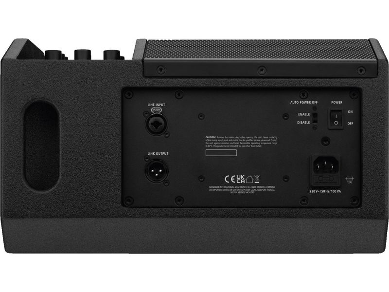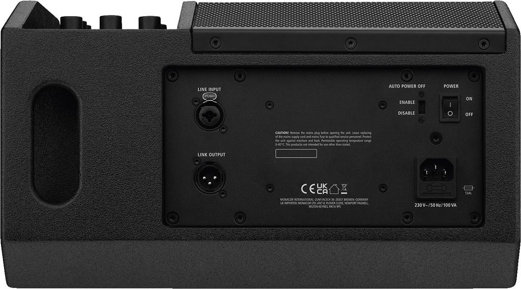 Active PA stage monitor speaker system, 300 W Flat and very compact full range system Fitted with a 20 cm (8") coaxial speaker with horn tweeter Class D amplifier system Sound pressure at nominal power: 121 dB Indication of protect, limiter, signal...