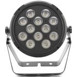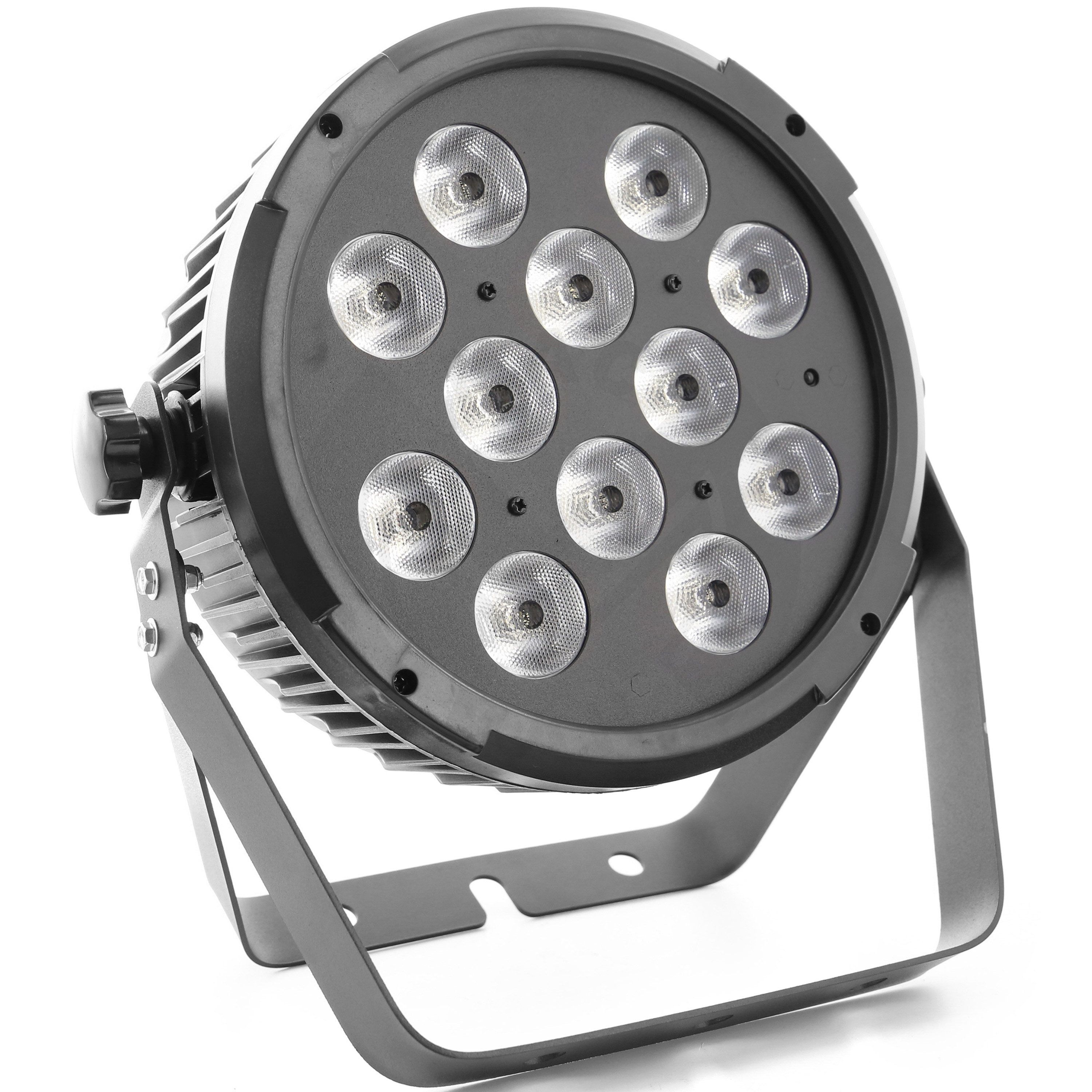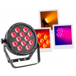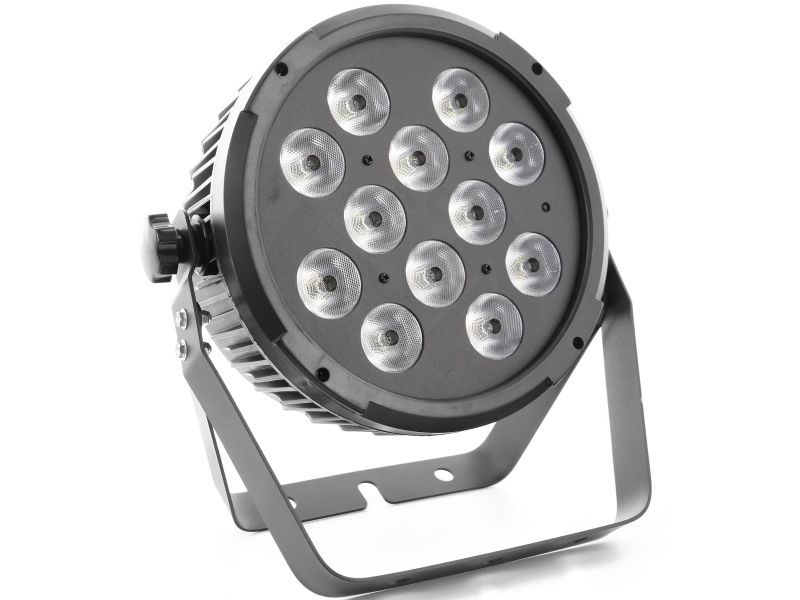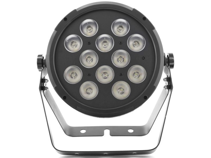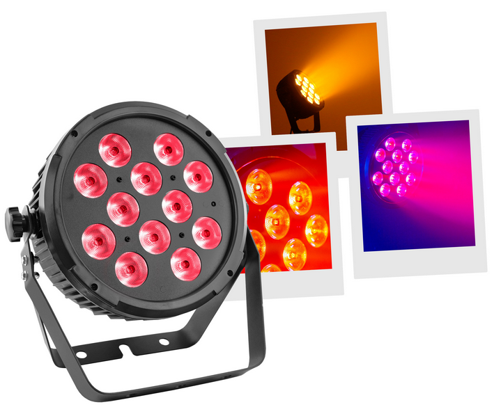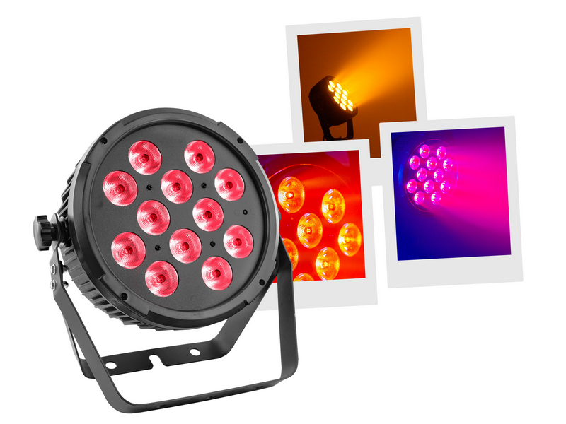 Flat led par with 12 12W 6 in 1 RGBWA-UV leds and an IR remote controlLed parlightProjection angle 25 °Controllable with DMX, Auto, Music, IR remote controlPlastic caseLink possible by female IEC power cableDouble mounting or fixing bracket