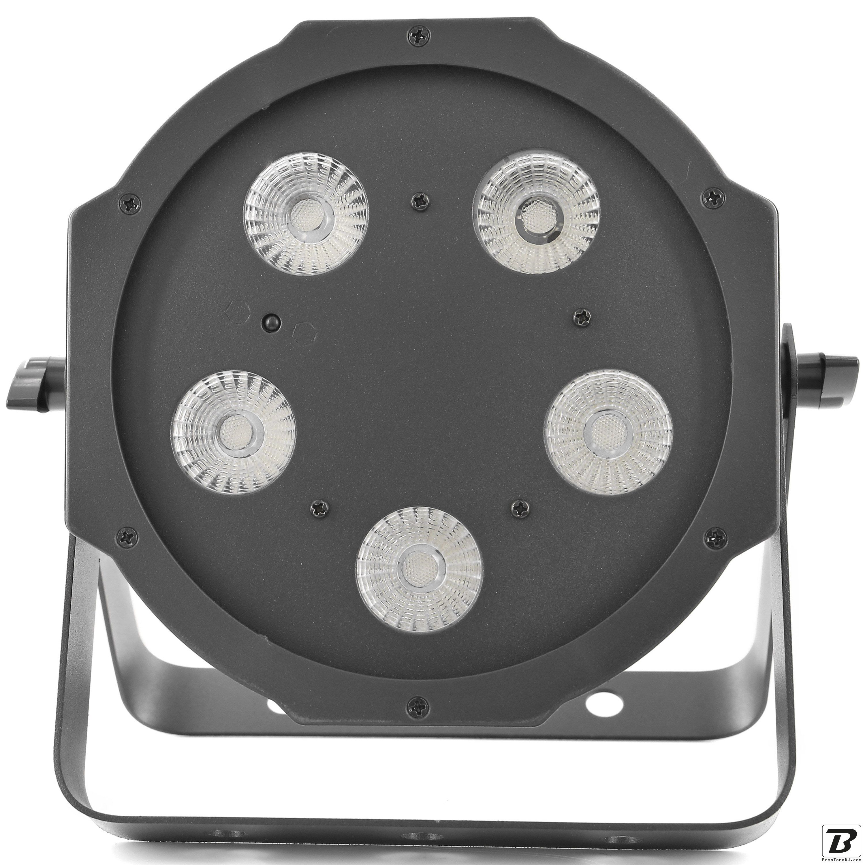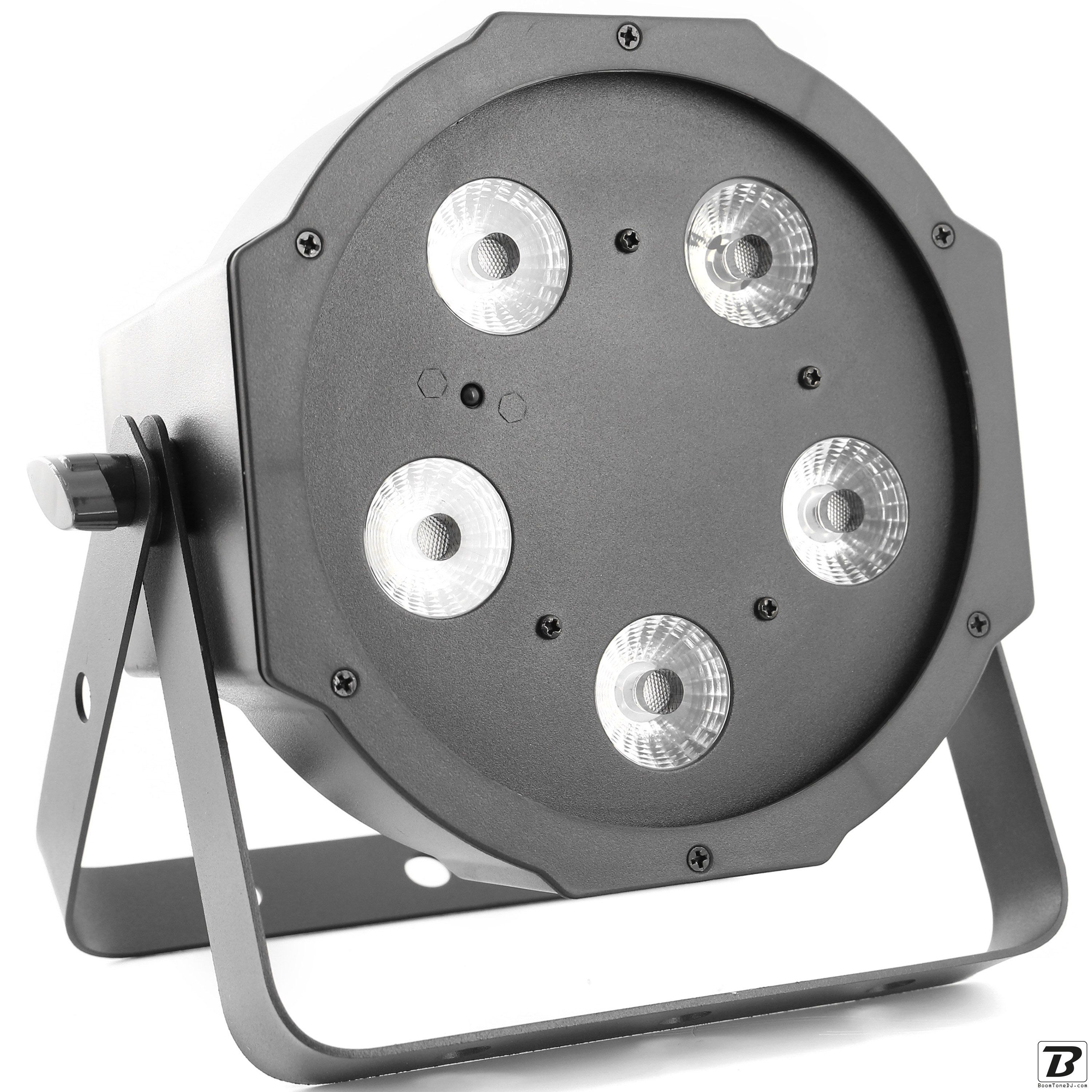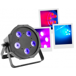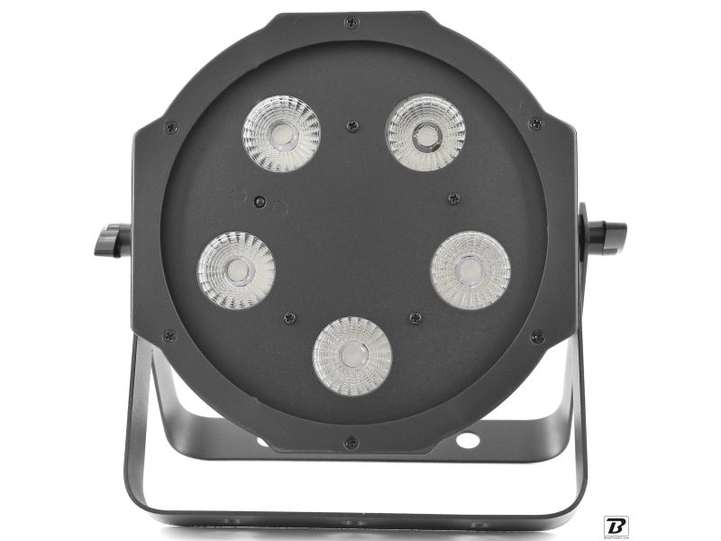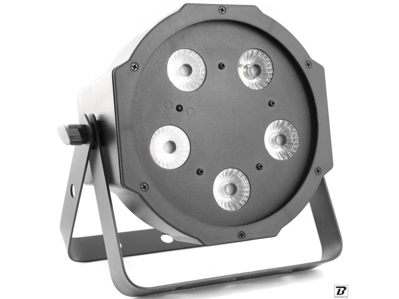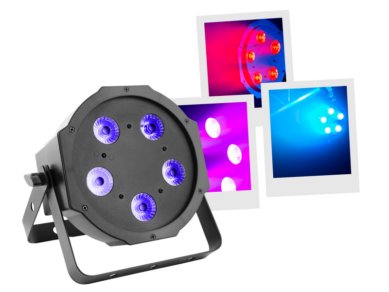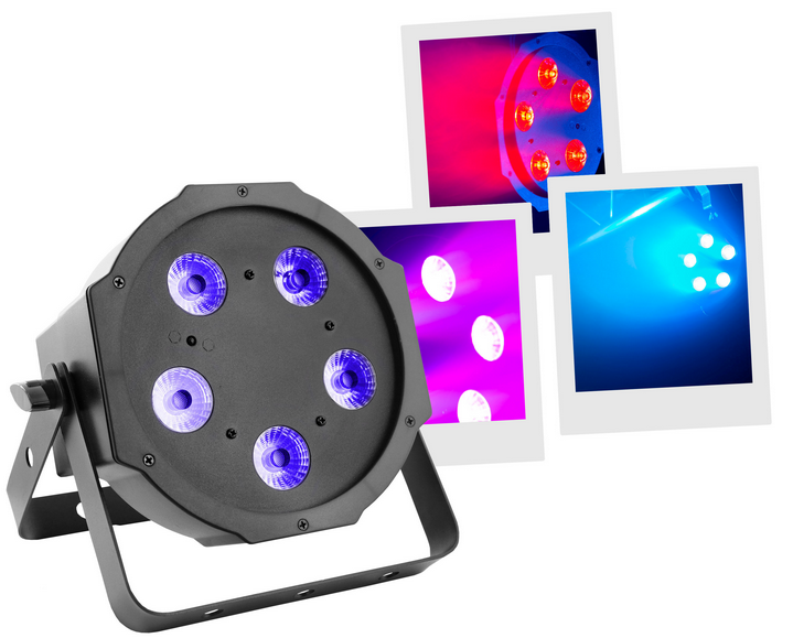 Flat led par with 5 leds of 5W 4 in 1 RGB-UVLed parlightProjection angle 25 °Controllable with DMX, Auto, Music, IR remote controlPlastic caseLink possible by female IEC power cableDouble mounting or fixing bracket