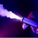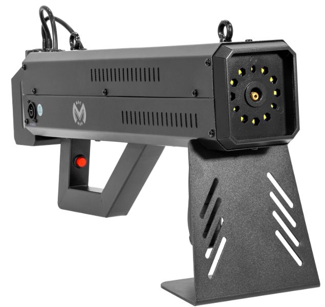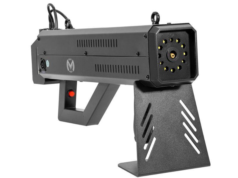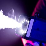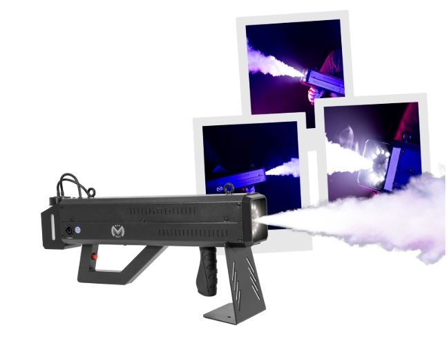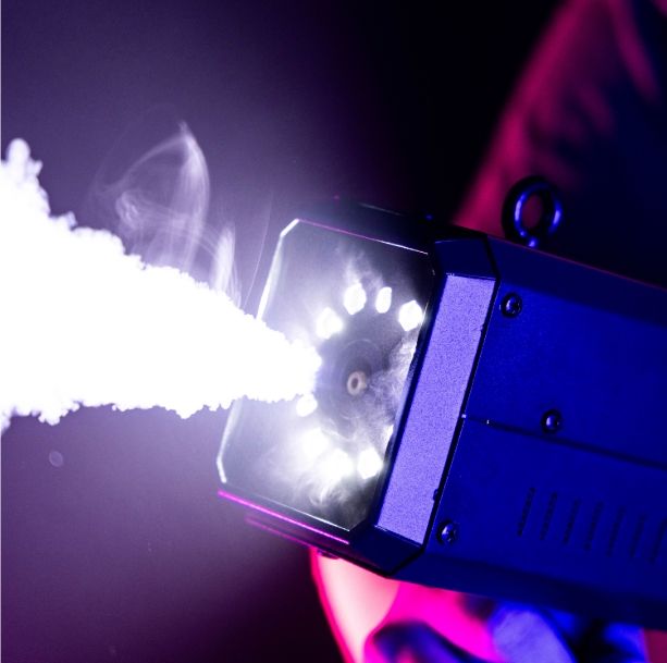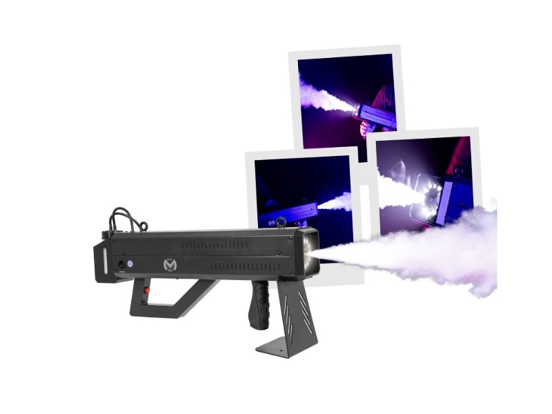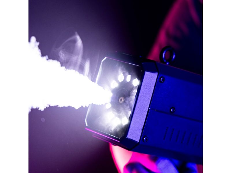 Mac Mah Fog Blaster 1000: portable fog machine with CO2 effect and strobe LEDs. Ideal for DJs and live stages, with projection up to 6 m and trigger release.
