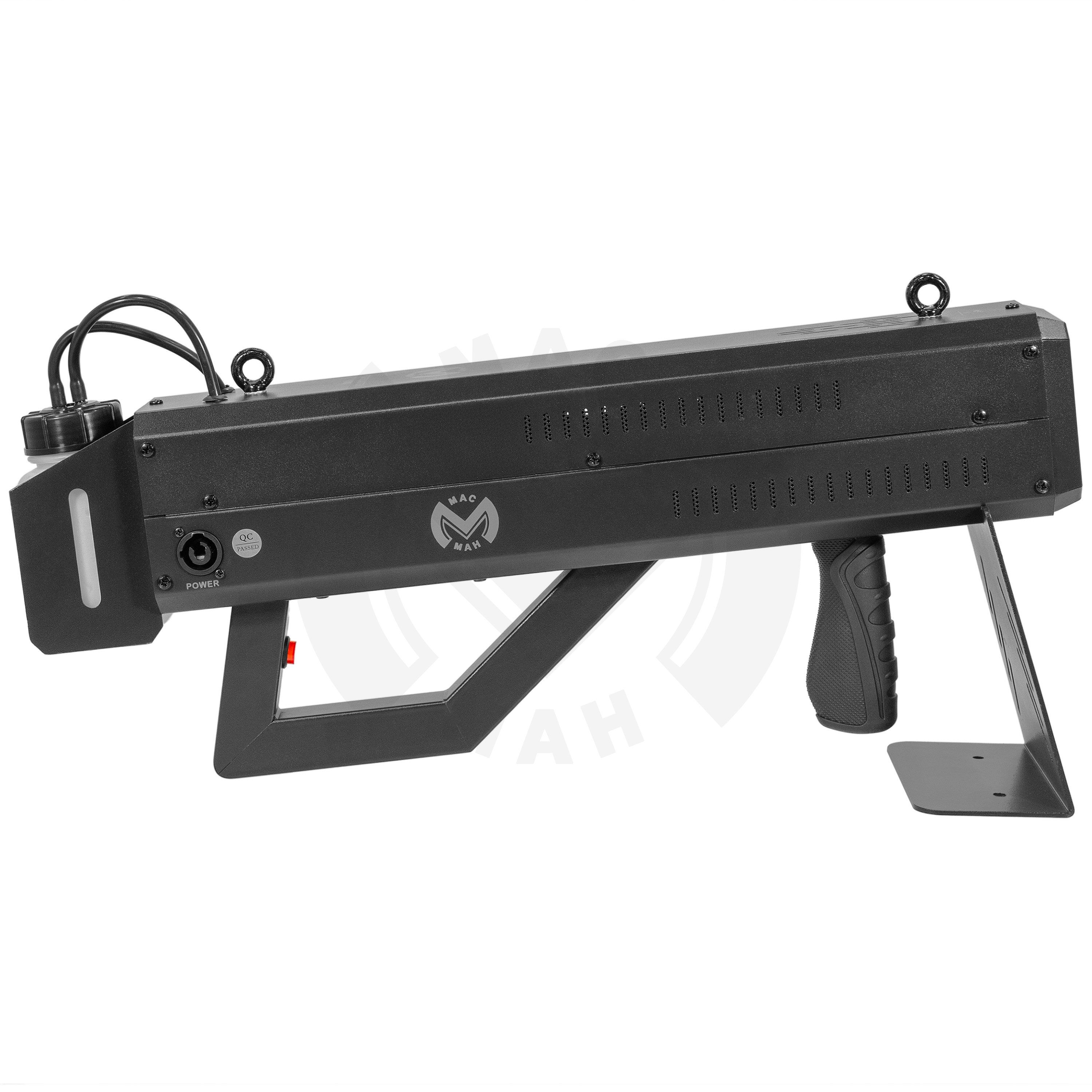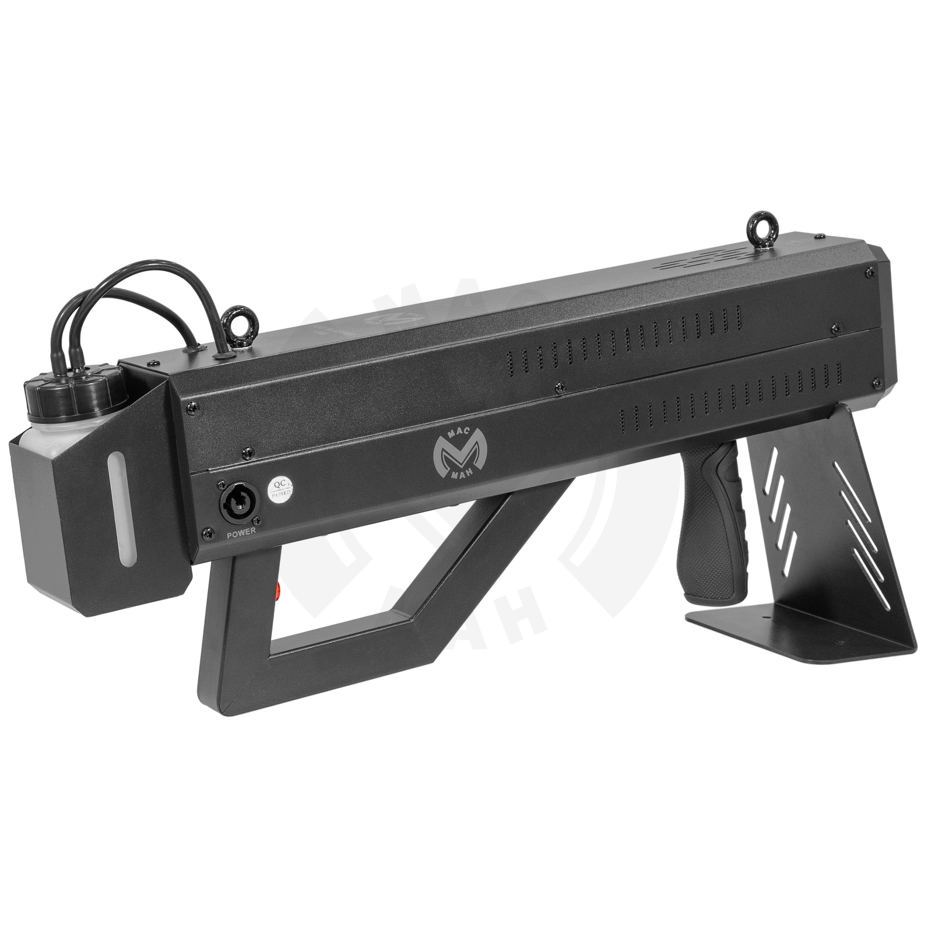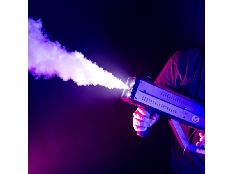 Mac Mah Fog Blaster 1000: portable fog machine with CO2 effect and strobe LEDs. Ideal for DJs and live stages, with projection up to 6 m and trigger release.Portable fog machineUse water#based CO2 fog fluid for optimum effect (BoomTone DJ or evolite).Fill...