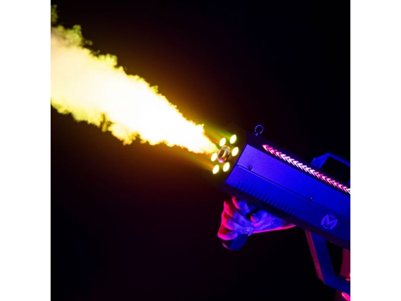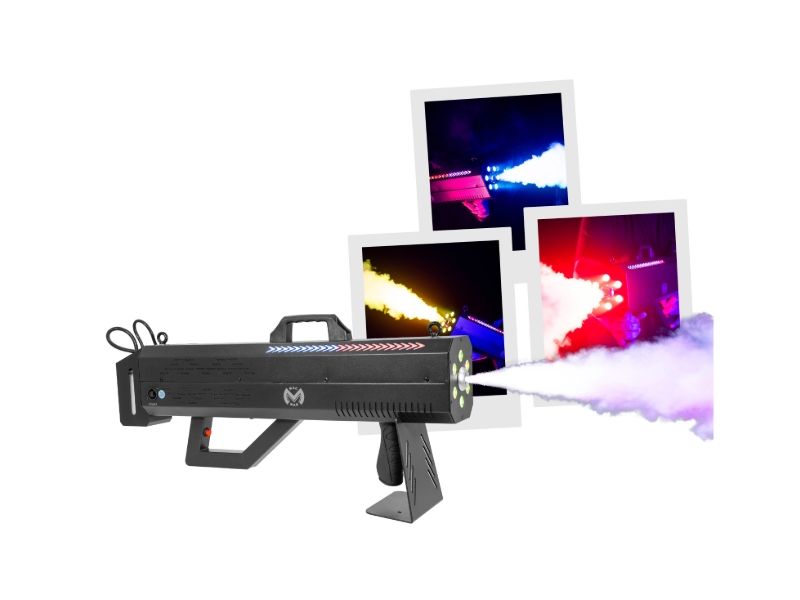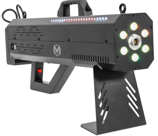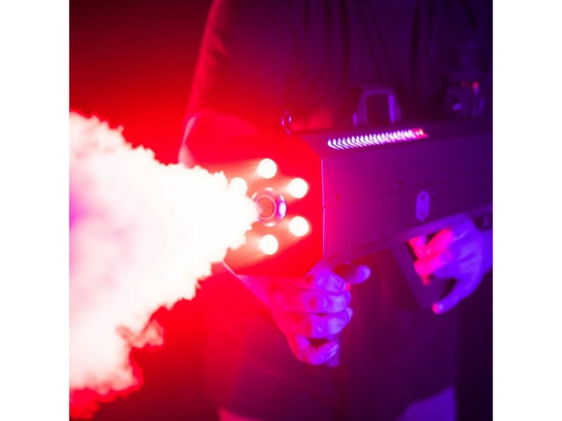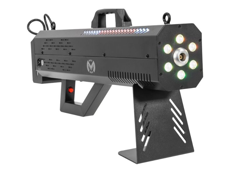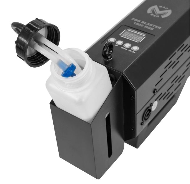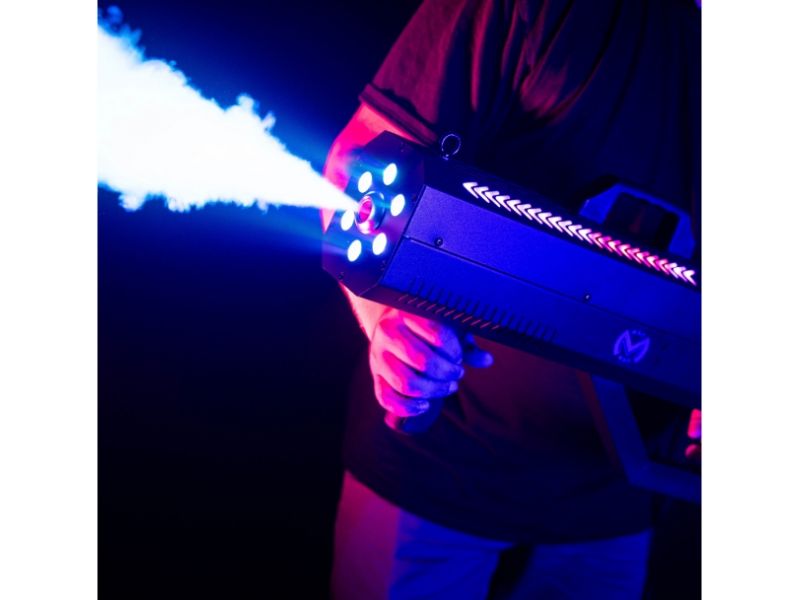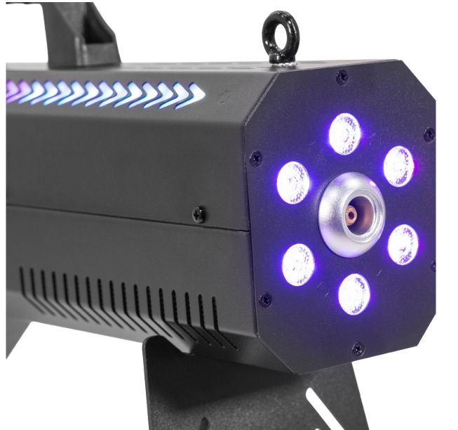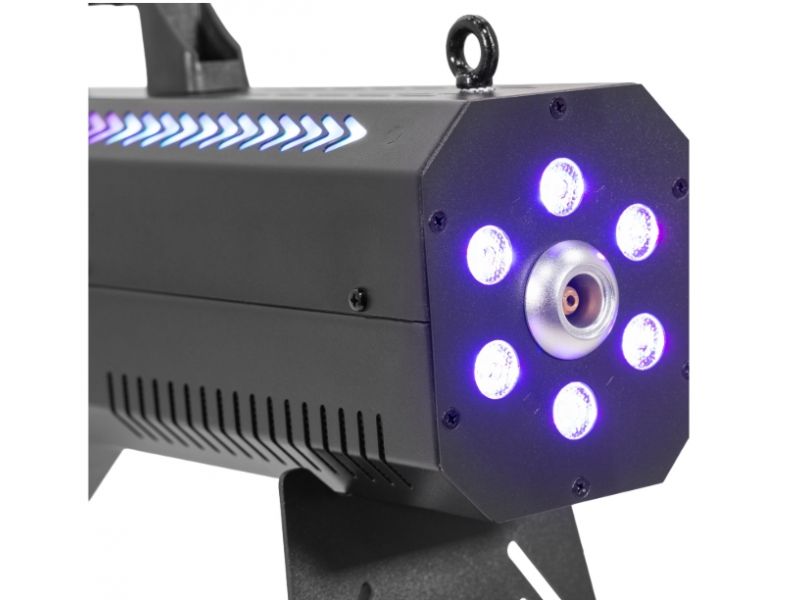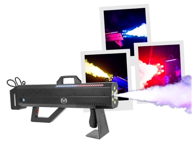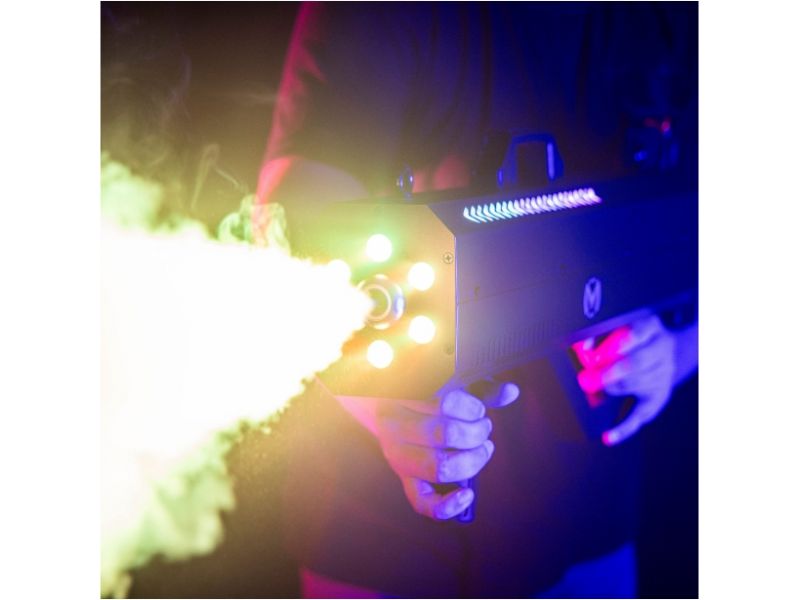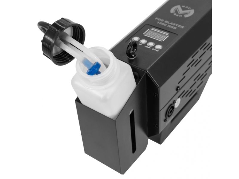 Discover the Mac Mah Fog Blaster 1500 RGB: 1,500 W portable fog machine, RGB LED, 8-10 m range, 0.3 L tank, rapid pre-heating and robust casing.