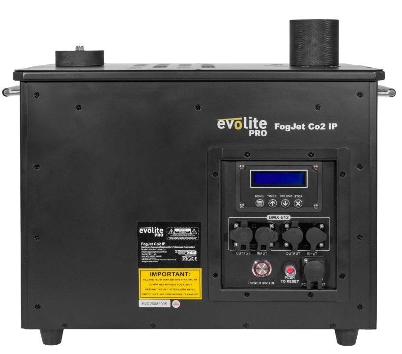 Evolite Pro FogJet Co2 IP - CO2 fog machine, 3500 W, jets up to 15 m, RGB LEDs, IP54, DMX 5/11 channels. Perfect for outdoor concerts and festivals.