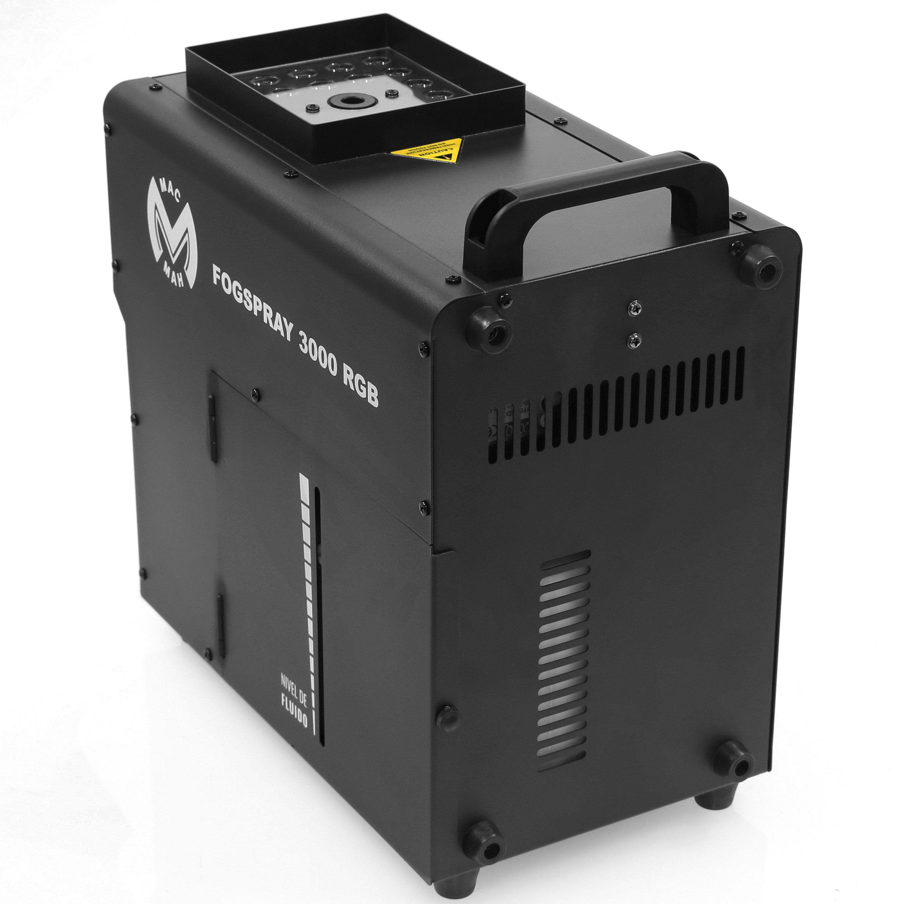 Smoke machine with integrated RGB LED projector, Mac Mah Fog Spray 3000 RGB.Mac Mah Fog Spray 3000 RGBVertical or horizontal smoke machineProduces white smoke, colored by the LED lighting at the base of the smoke outlet.
