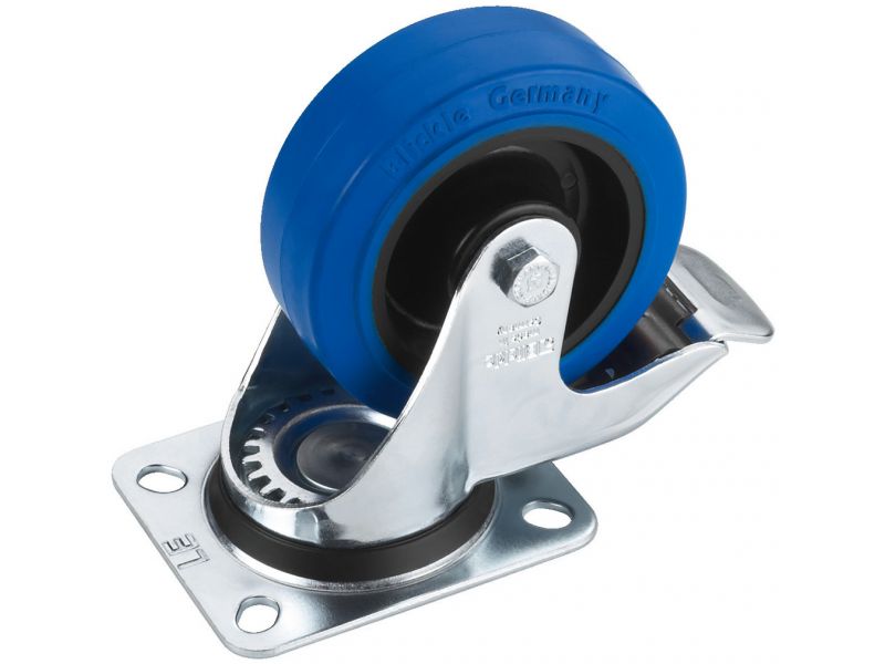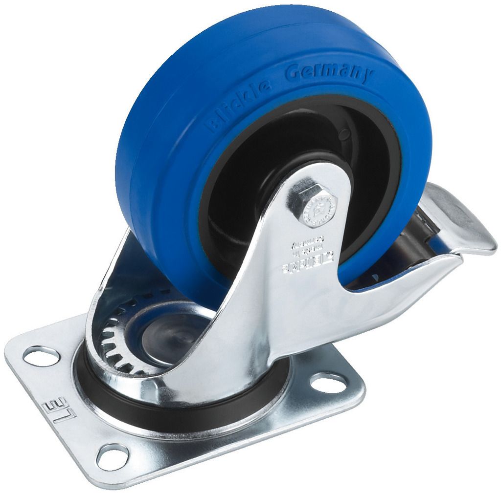 Vysokokvalitné otočné koliesko: Ø 100 mm, s brzdou Zn. Blickle napr. pre transport PA reproduktorového systému alebo skríň Klzné ložiská kolies a riadenie guľôčkovým ložiskom Celogumené kolieska, bez zanechávania čiar Pozinkované kovové časti