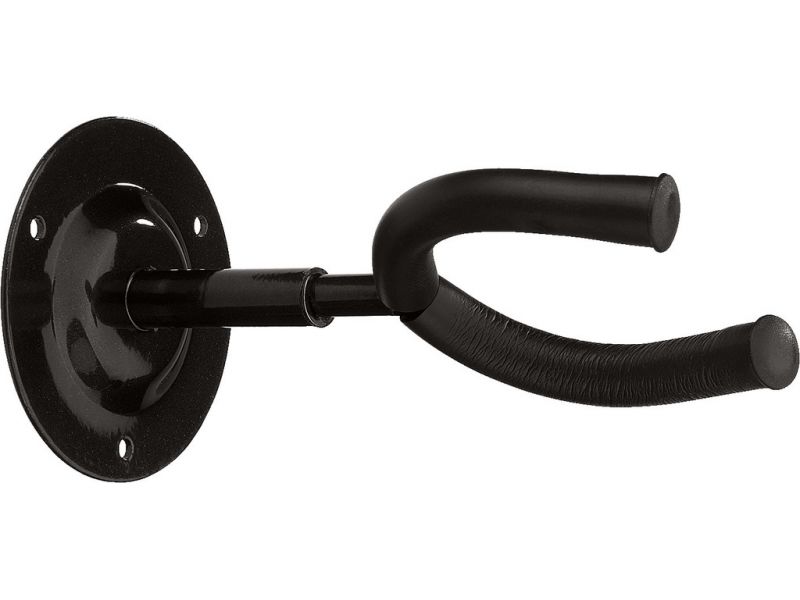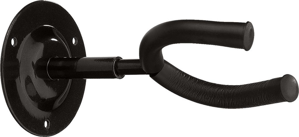 Nástenný držiak pre gitary, čierny lakovaný. Krátka verzia s jemným pogumovaním. Dĺžka: 174 mmMontážna príruba: Ø 89 mmVzdialenosť diery: 62 mm