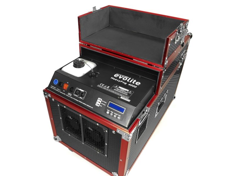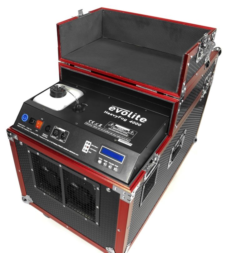 evolite HeavyFog 4000 compact professional heavy fog machineevolite HeavyFog 4000Professional heavy fog machine in flight caseProduces thick fog that stays on the groundUse with Lowfog type heavy fog fluid only2 DMX channelsLCD screen for settingsContinuo...