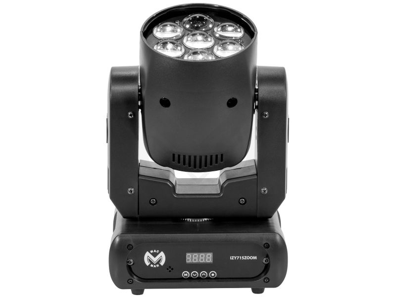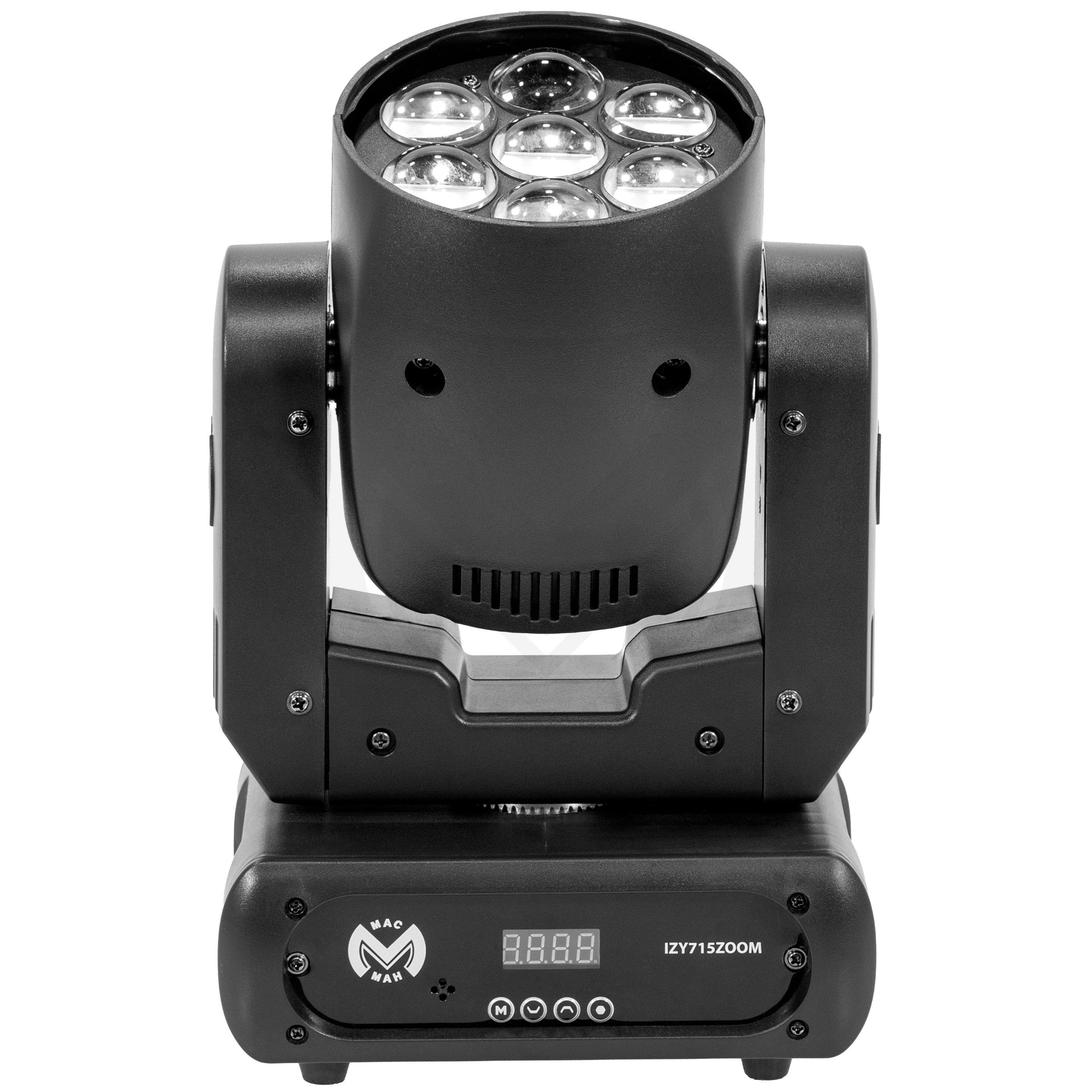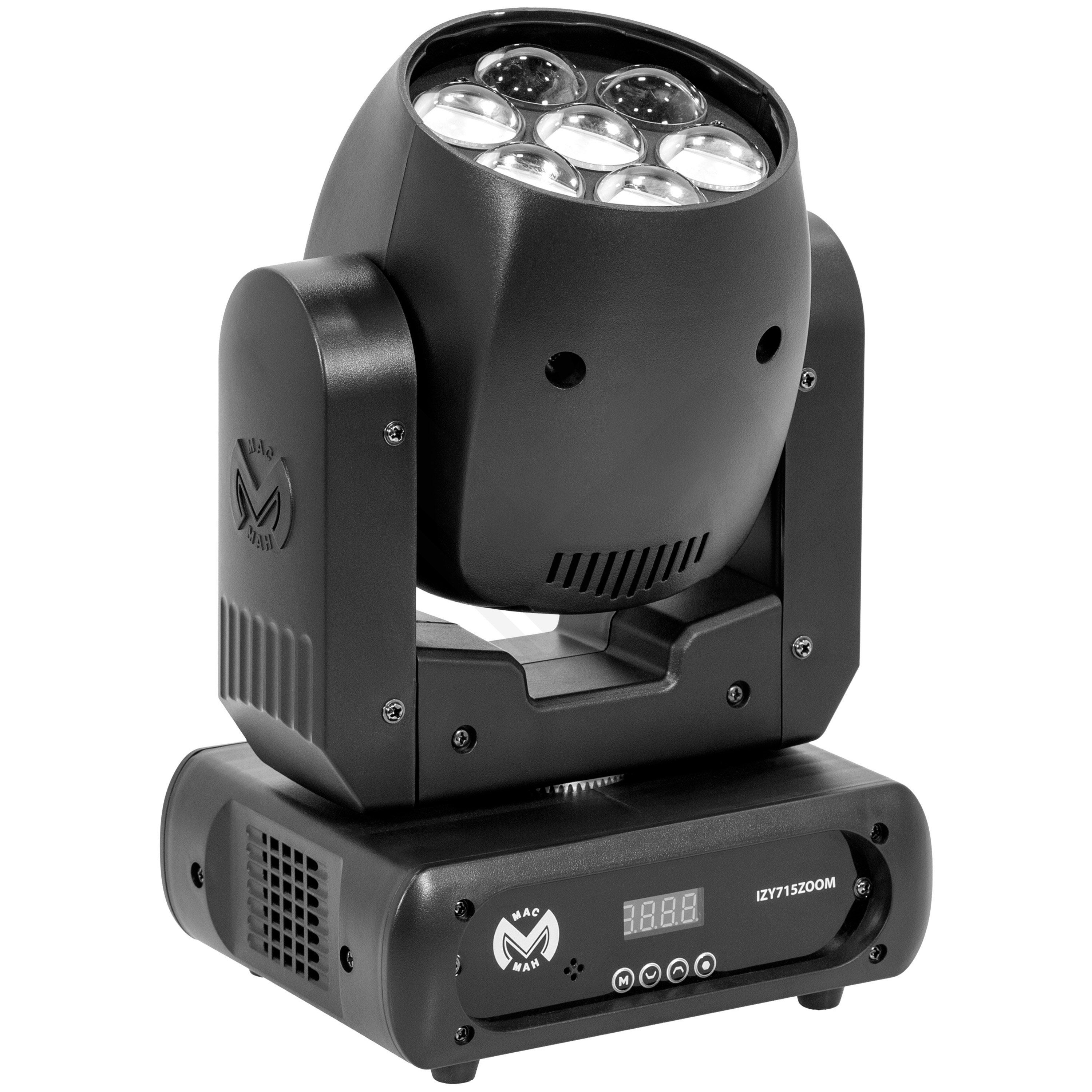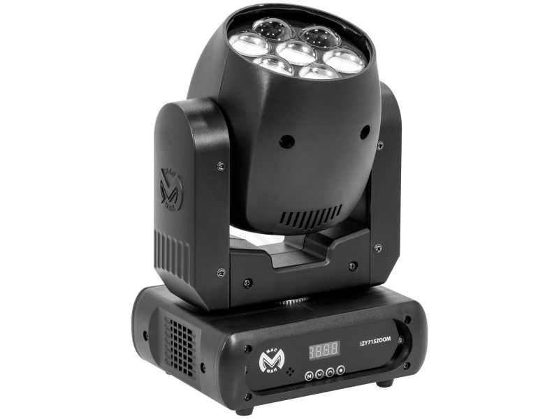 Wash Mac Mah IZY 715 Zoom, equipped with 7 x 15 W 4-in-1 RGBW LEDs, variable zoom (6° to 36°) and DMX, auto, sound and master-slave control modes. A versatile solution for IP20 indoor lighting.Mac Mah IZY 715 ZoomLED Wash