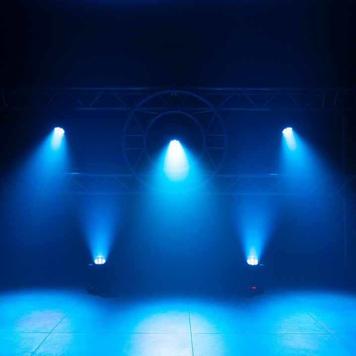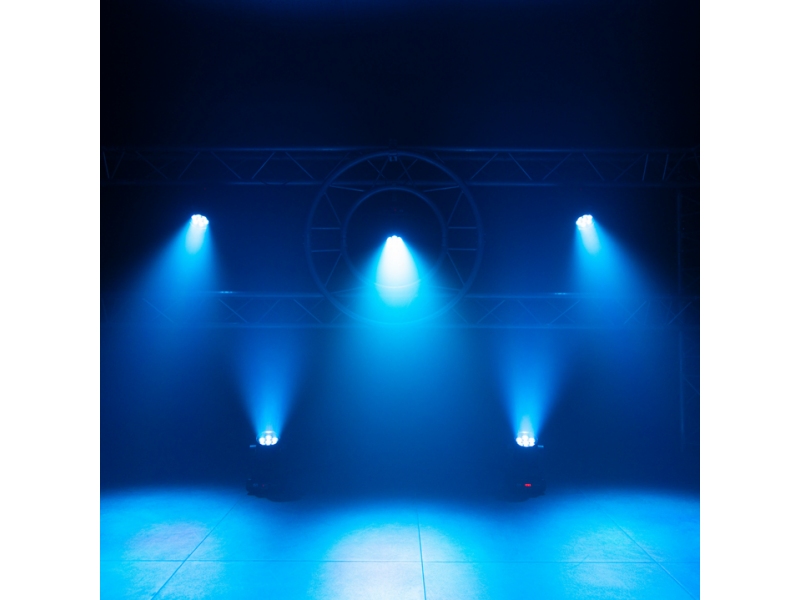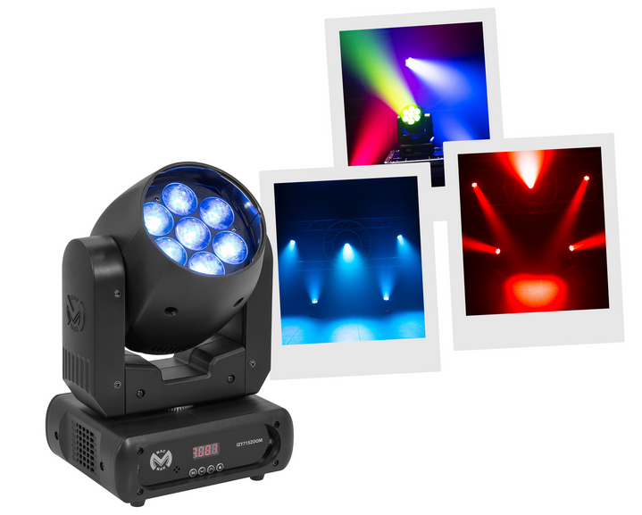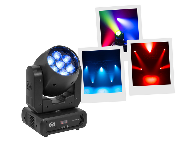 Wash Mac Mah IZY 715 Zoom, equipped with 7 x 15 W 4-in-1 RGBW LEDs, variable zoom (6° to 36°) and DMX, auto, sound and master-slave control modes. A versatile solution for IP20 indoor lighting.
