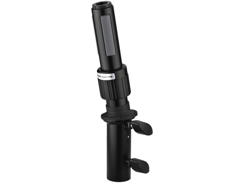 Násuvný sklopný adaptér pre reproduktorové stojany, s patentovaným rozpínacím tŕňom pre pevné, nízko rezonančné spojenie adaptéra a PA skrinky pomocou plastových rozpínacích čeľustí Čierna lakovaná oceľová verzia Nastaviteľný uhol sklonu: 0-15 °, zaist...