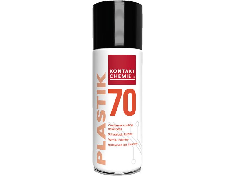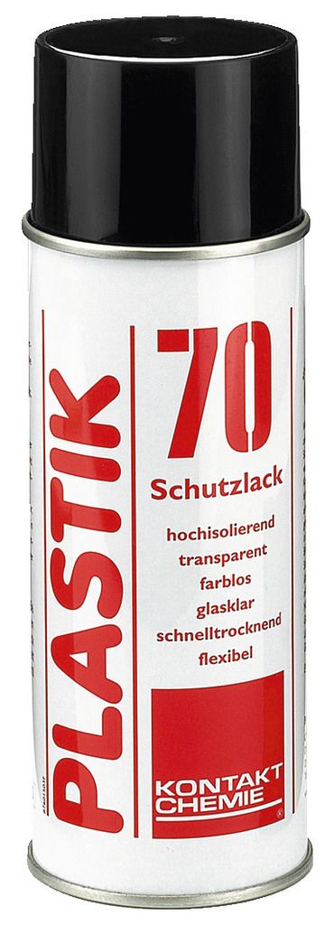 Plast 70 Ochranný lak, pre dosky plošných spojov a elektronické komponenty chráni dosky plošných spojov pred vlhkosťou a normálnymi vplyvmi prostredia. Dielektrická pevnosť je cca. 110 kV/mm. Poznámka: Počas opravy je možné lak spájkovať.