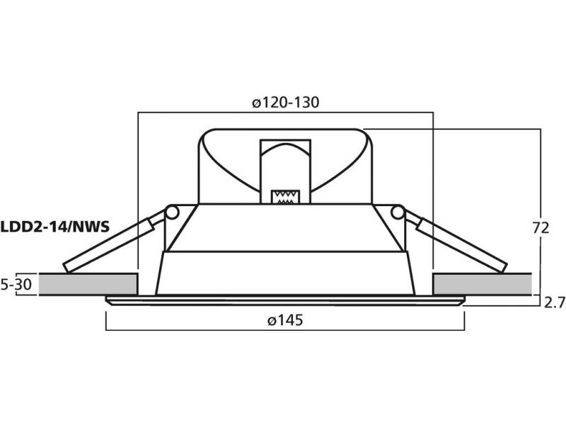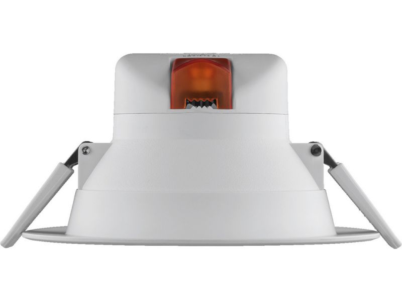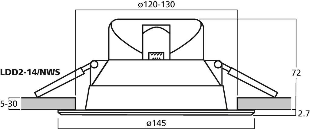 LED downlight, 14 W Neutrálna biela (NWS) alebo teplá biela (WWS) Uhol lúča: 90° Biele plastové puzdro s ochrannoým predným krytom Na inštaláciu do stropných výrezov: Ø 120-130 mm Pre hrúbku stropu 5 až 30 mm Zariadenie na rýchlu montáž...