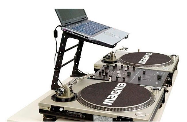 DJ stand for laptop, black color. Installation on horizontal plane, is fixed directly on flight-case, metal frame.