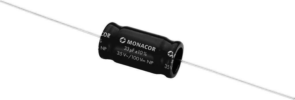 Bipolárny elektrolytický kondenzátor 1.5-220 µF pre audio frekvenčné aplikácie, stabilný pre napätia 35V AC/100V DC, 150W/8Ω, 300W/4Ω. Veľmi nízky stratový činiteľ, dlhodobá stabilita.