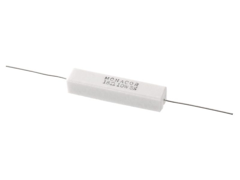 Výkonný cementový odpor, 18 Ω, 10 W Odpor pre použitie vo výhybkách, predovšetkým pre PA a špičkové aplikácie, tiež sa pripájajú ako záťažové odpory.