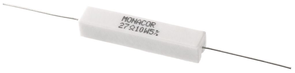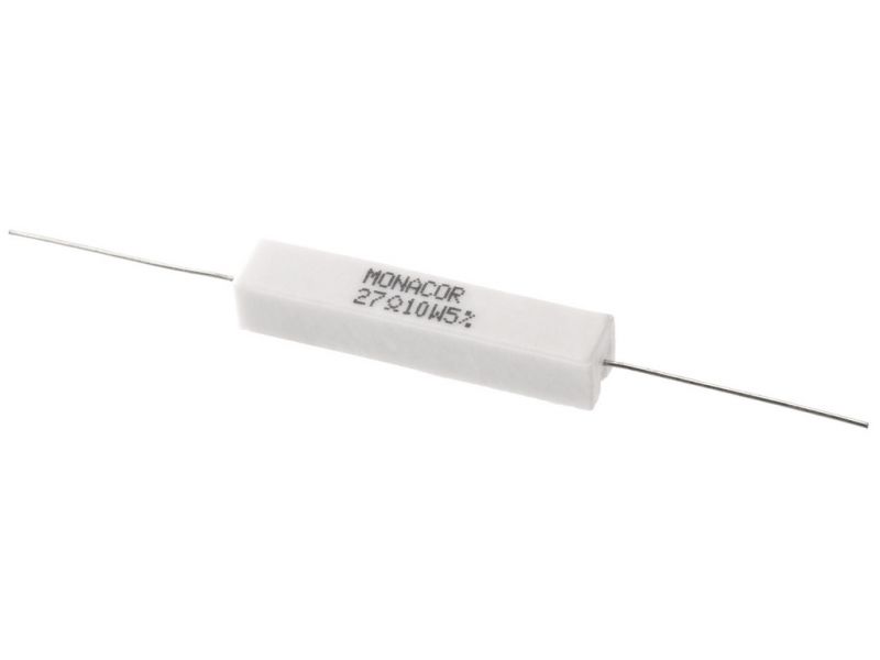 Výkonný cementový odpor, 27 Ω, 10 W Odpor pre použitie vo výhybkách, predovšetkým pre PA a špičkové aplikácie, tiež sa pripájajú ako záťažové odpory.