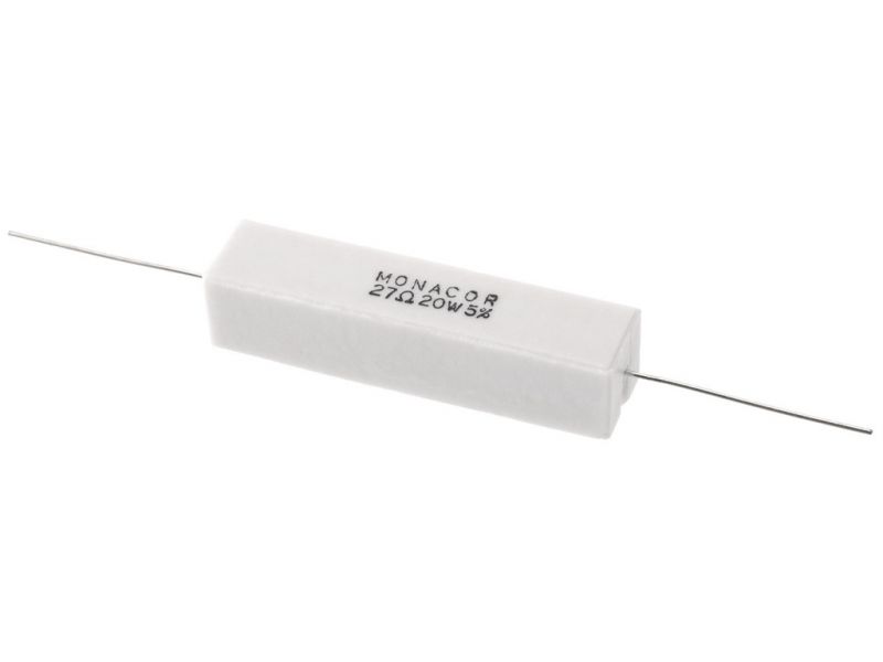Výkonný cementový odpor, 27 Ω, 20 W Odpor pre použitie vo výhybkách, predovšetkým pre PA a špičkové aplikácie, tiež sa pripájajú ako záťažové odpory.